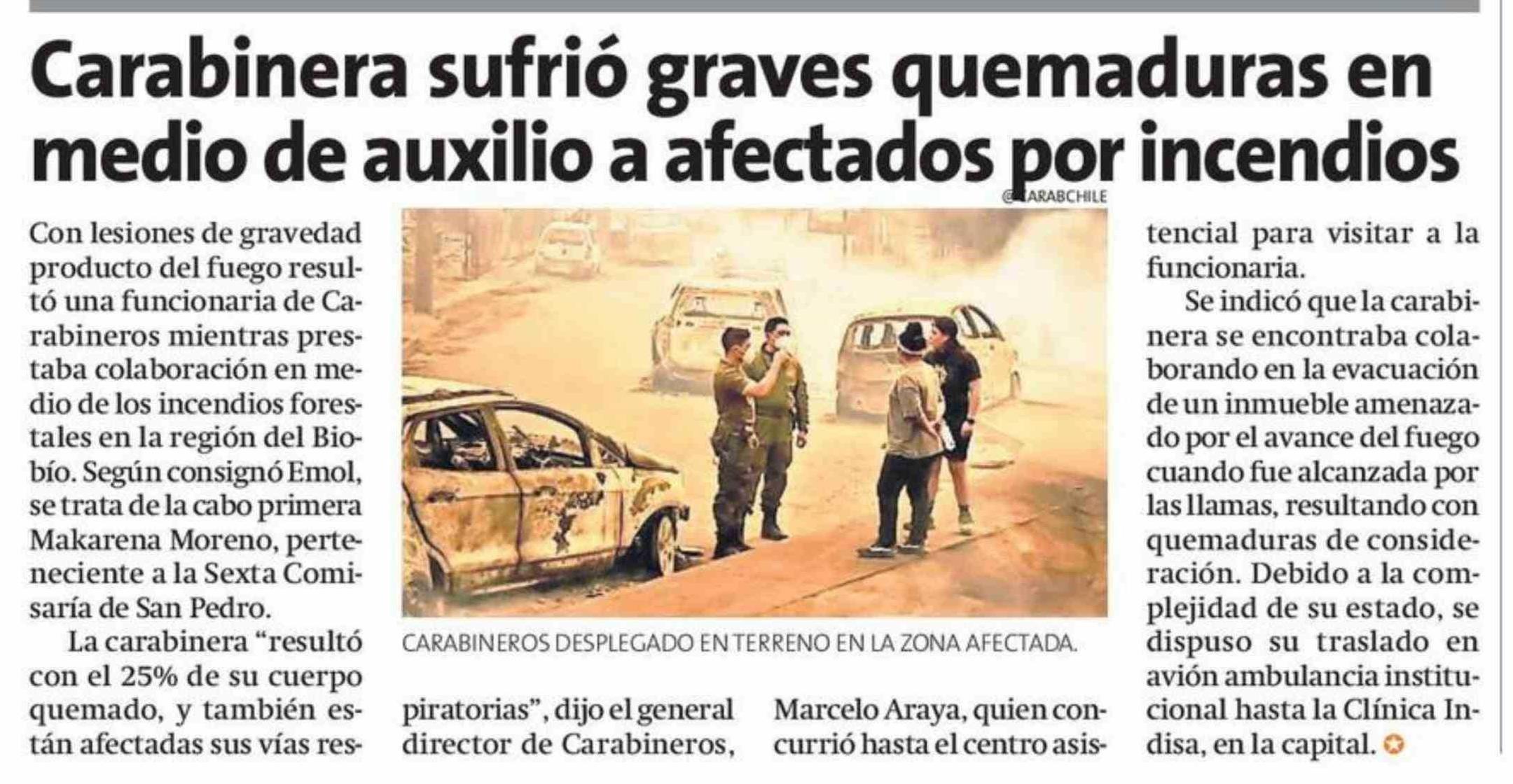 Título: Carabinera sufrió graves quemaduras en medio de auxilio a afectados por incendios