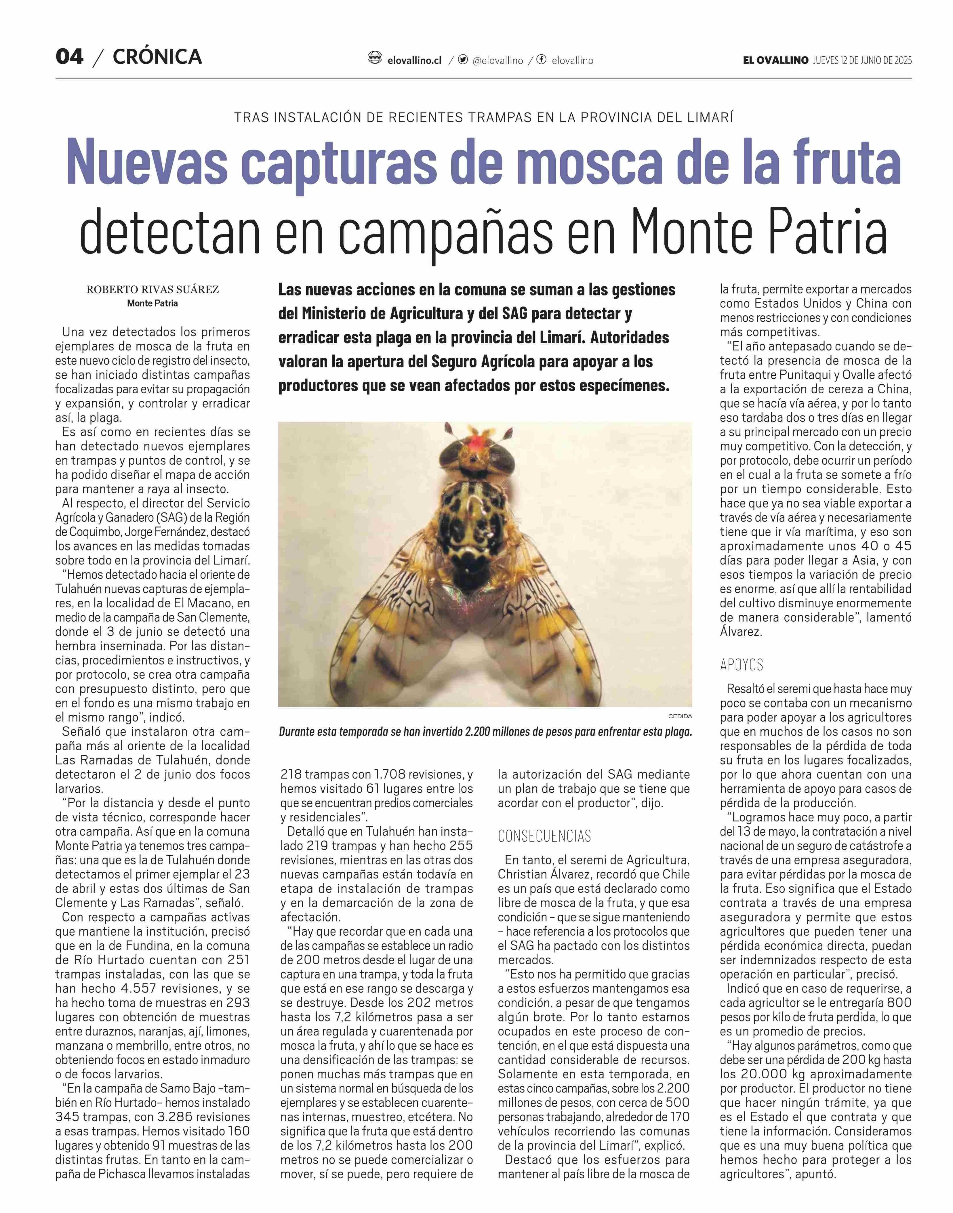 Nuevas capturas de mosca de la fruta detectan en campañas en Monte Patria 12-06-2025 El Ovallino |