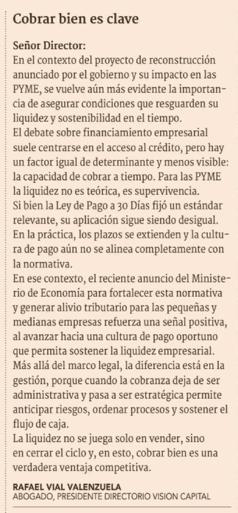 Cartas: Cobrar bien es clave 23-04-2026 Diario Financiero |
