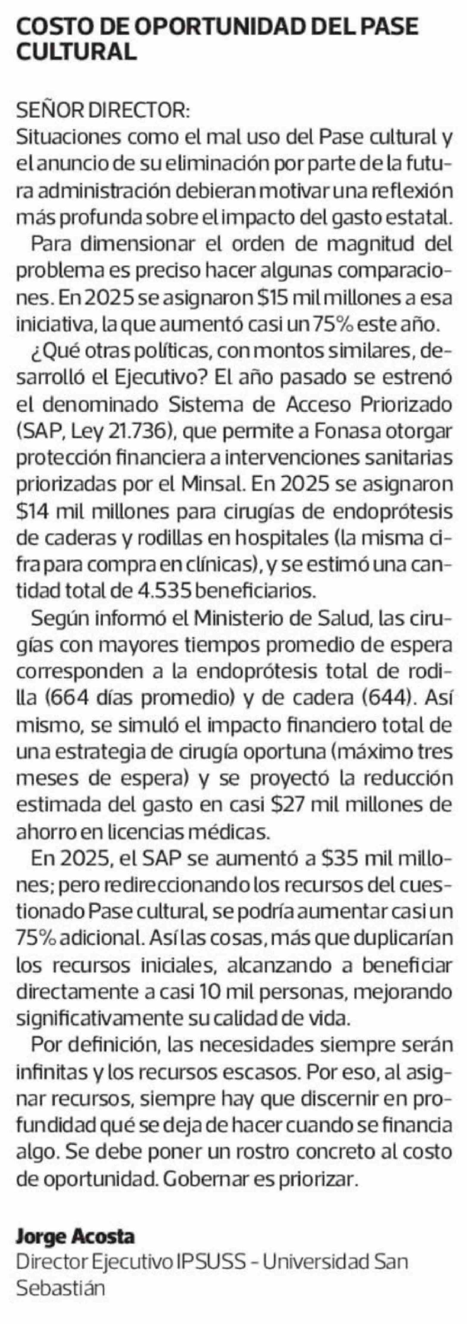 Cartas: COSTO DE OPORTUNIDAD DEL PASE CULTURAL 04-02-2026 La Tercera |