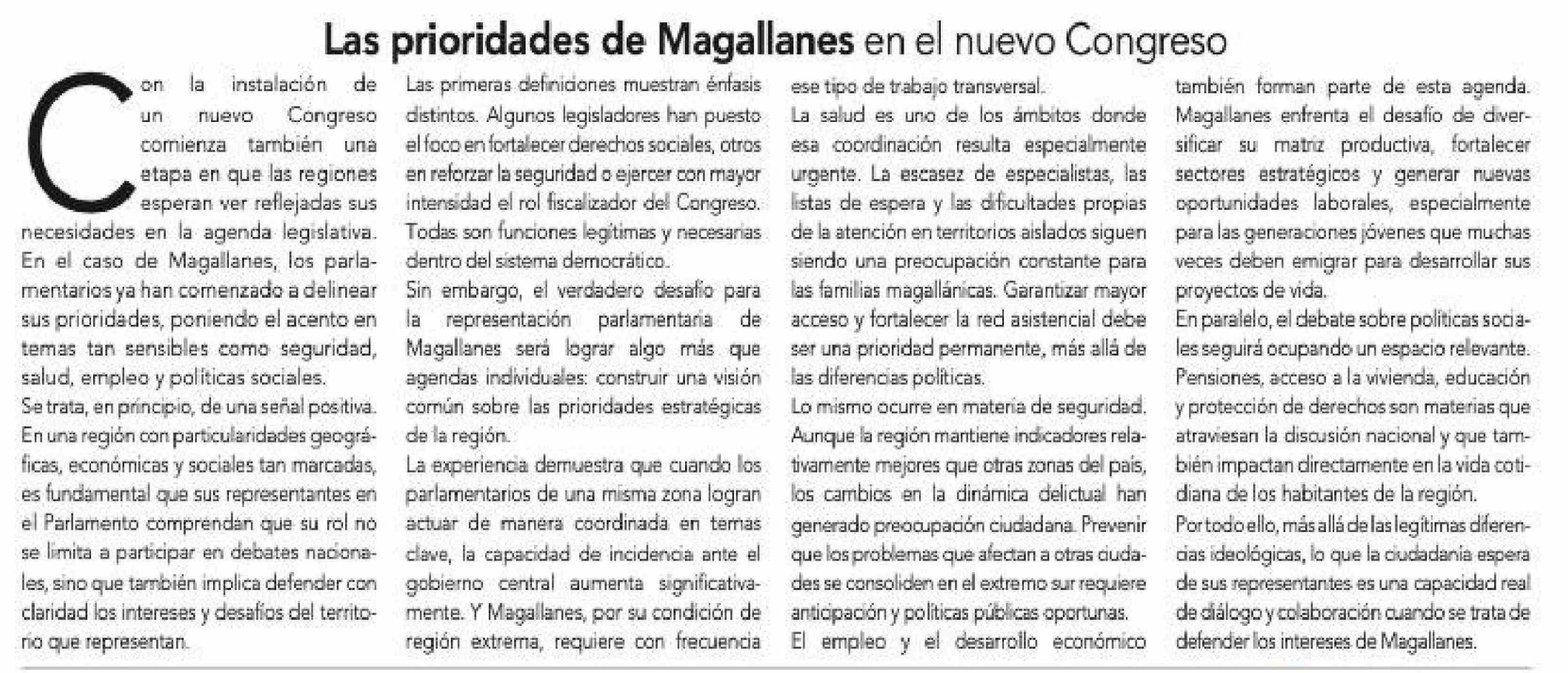 Título: Editorial: Las prioridades de Magallanes en el nuevo Congreso