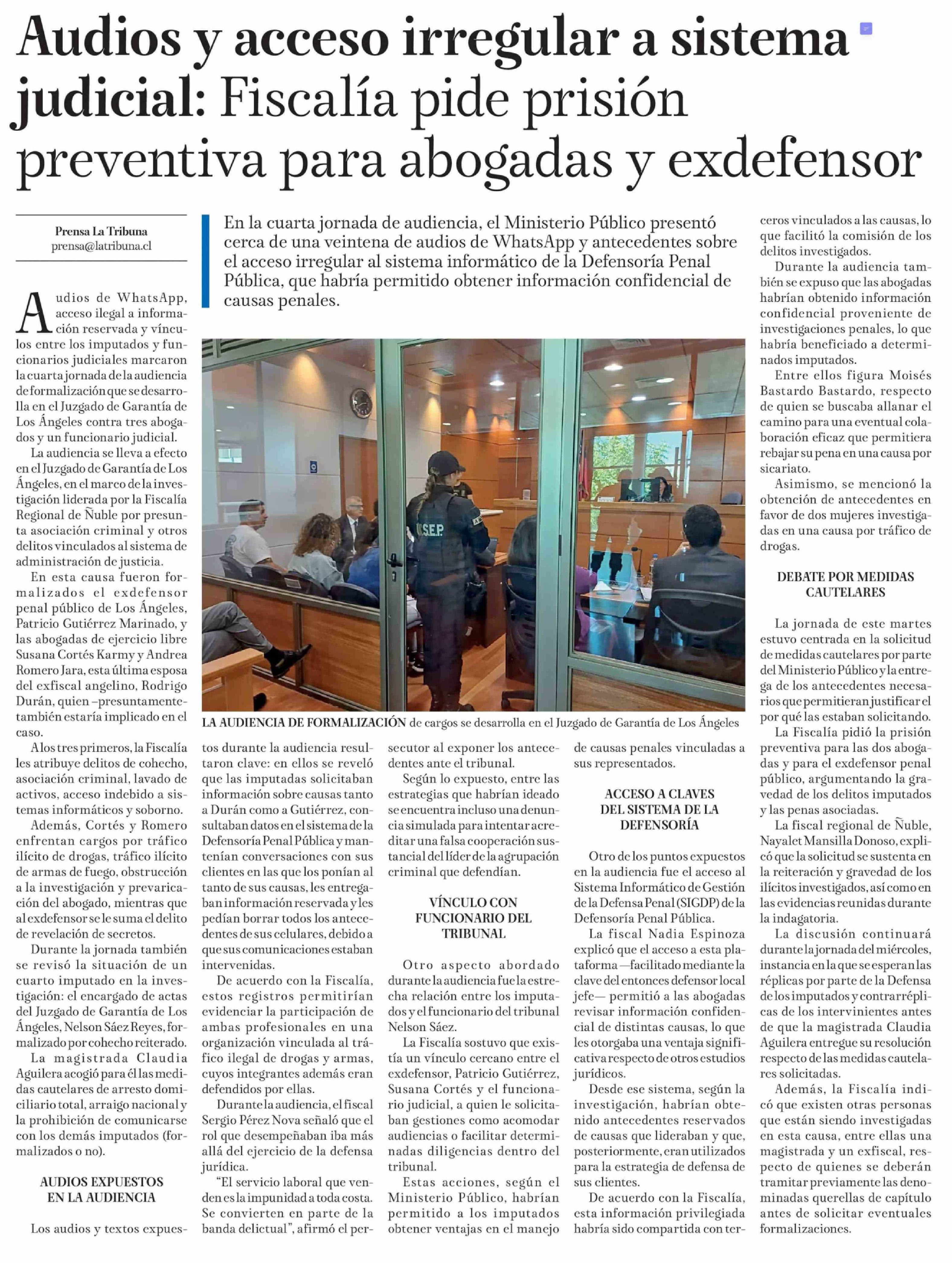 | Título: | Audios y acceso irregular a sistema judicial: Fiscalía pide prisión preventiva para abogadas y exdefensor |