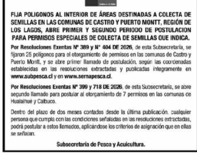 Extractos: FIJA POLIGONOS AL INTERIOR DE ÁREAS DESTINADAS A COLECTA DE SEMILLAS EN LAS COMUNAS DE CASTRO Y PUERTO MONTT, REGIÓN DE LOS LAGOS, ABRE PRIMER Y SEGUNDO PERIODO DE POSTULACION PARA PERMISOS ESPECIALES DE COLECTA DE SEMILLAS QUE INDICA. Por Resoluciones Exentas Nº 389 y Nº 404 DE 2026, de