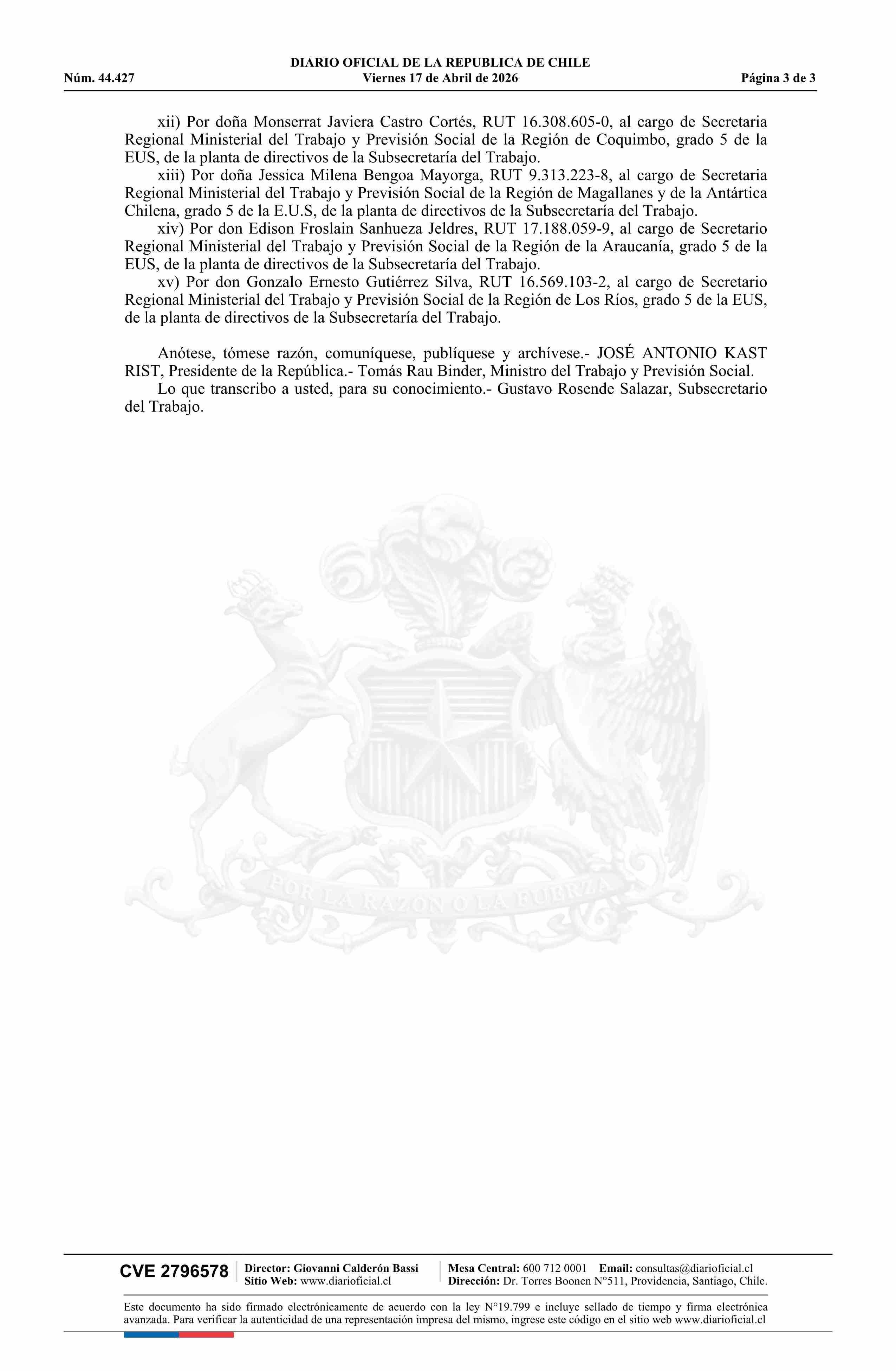 Decreto número 20, de 2026.- Acepta renuncia voluntaria al cargo de Secretario/a Regional Ministerial del Trabajo y Previsión Social de personas que se individualizan 17-04-2026 Diario Oficial Edición Electrónica |