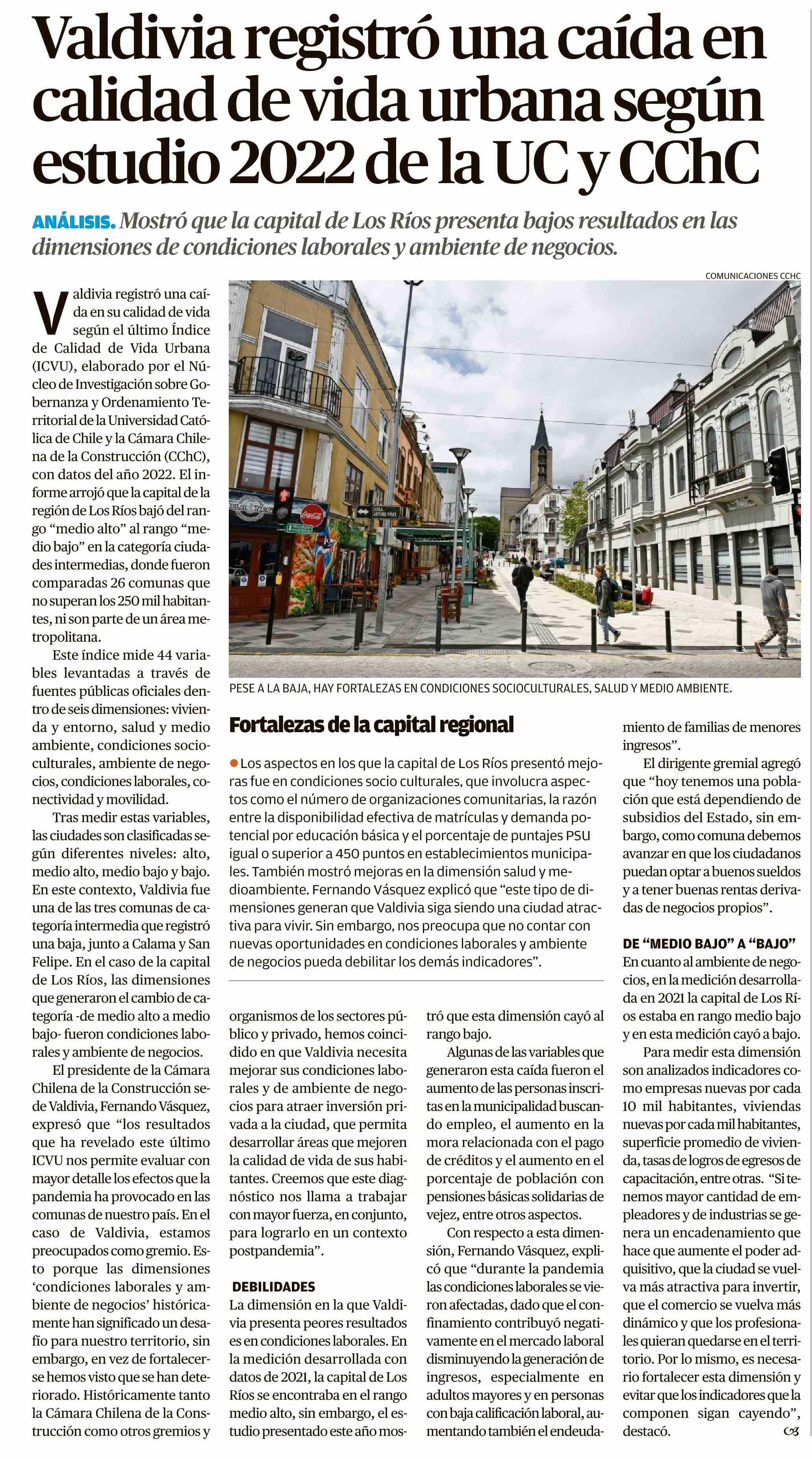 | Título: | Valdivia registró una caída en calidad de vida urbana según estudio 2022 de la UC y CChC |