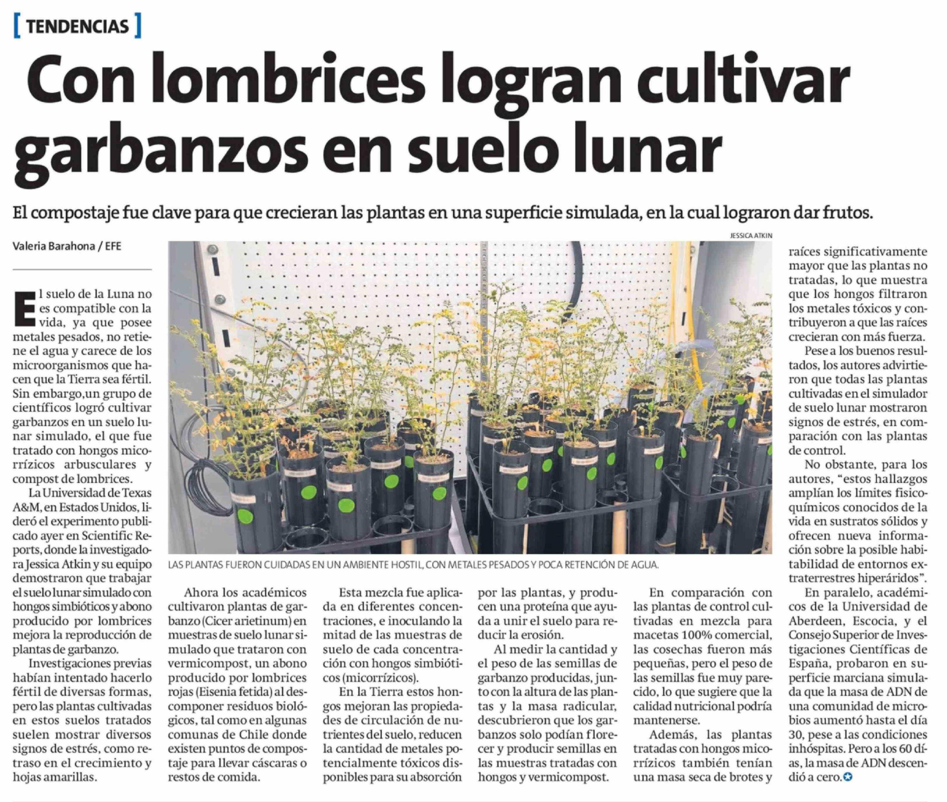 Con lombrices logran cultivar garbanzos en suelo lunar 07-03-2026 La Estrella de Antofagasta |