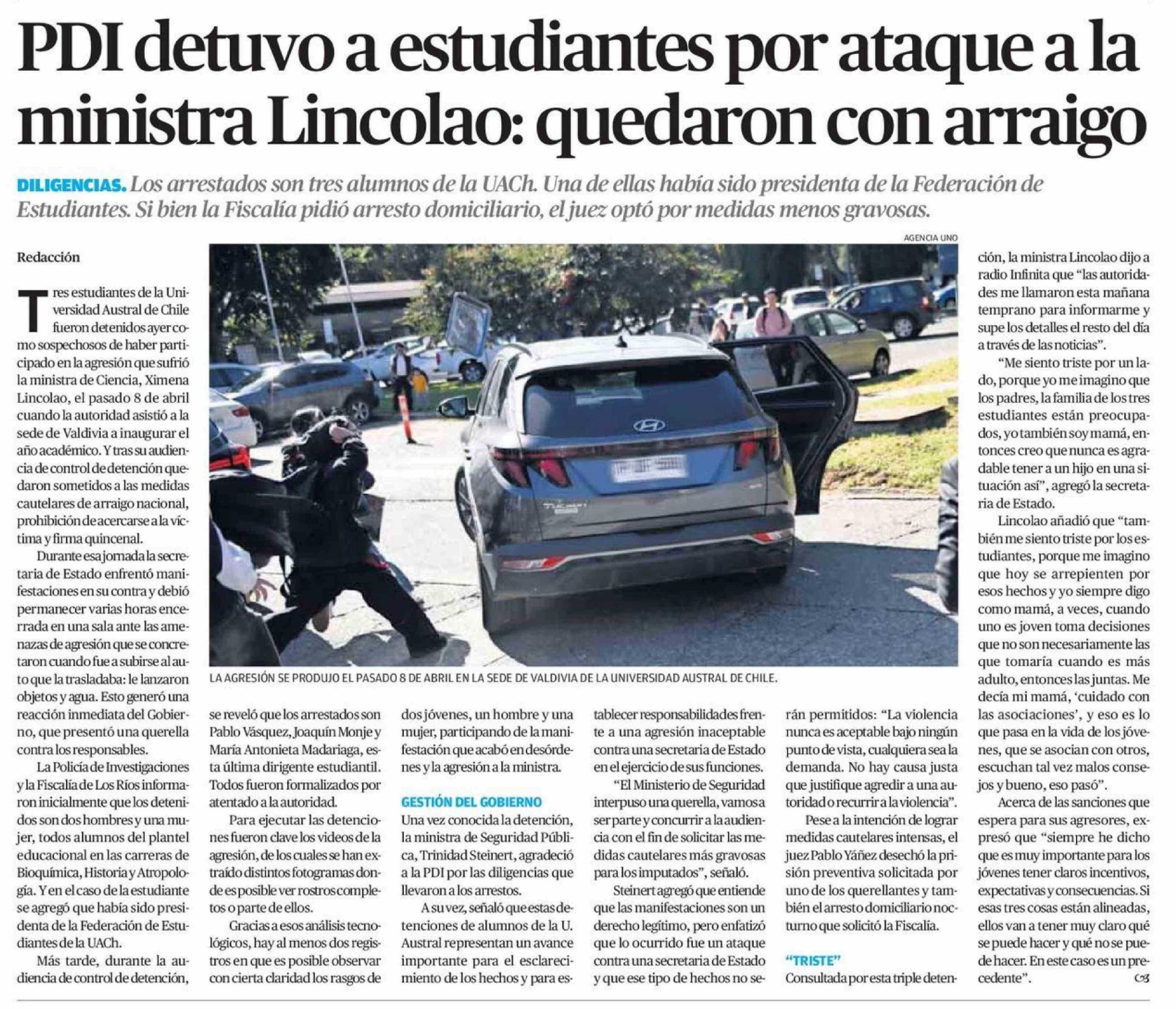 PDI detuvo a estudiantes por ataque a la ministra Lincolao: quedaron con arraigo 21-04-2026 El Mercurio de Calama |