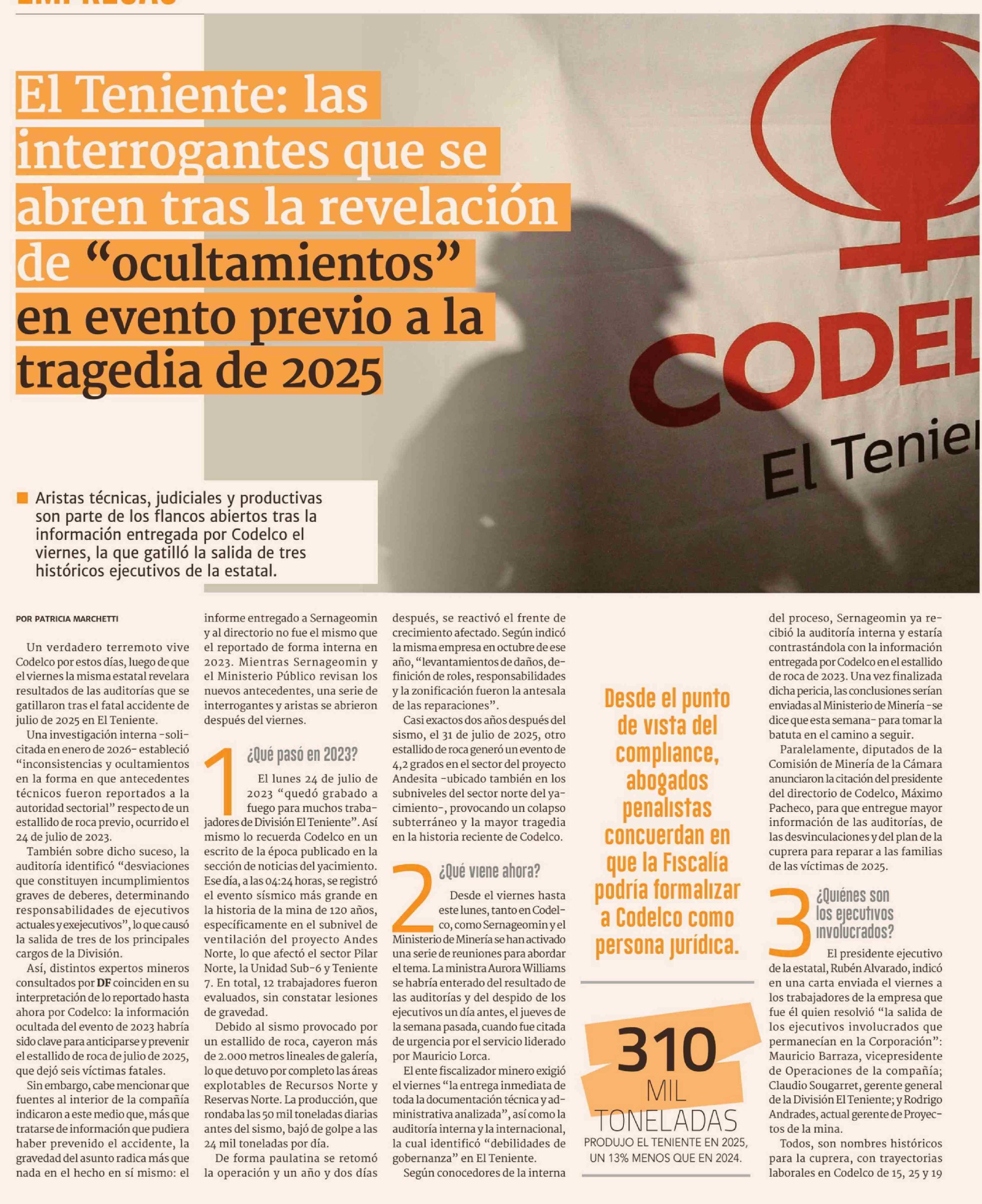 El Teniente: las interrogantes que se abren tras la revelación de "ocultamientos" en evento previo a la tragedia de 2025 17-02-2026 Diario Financiero |