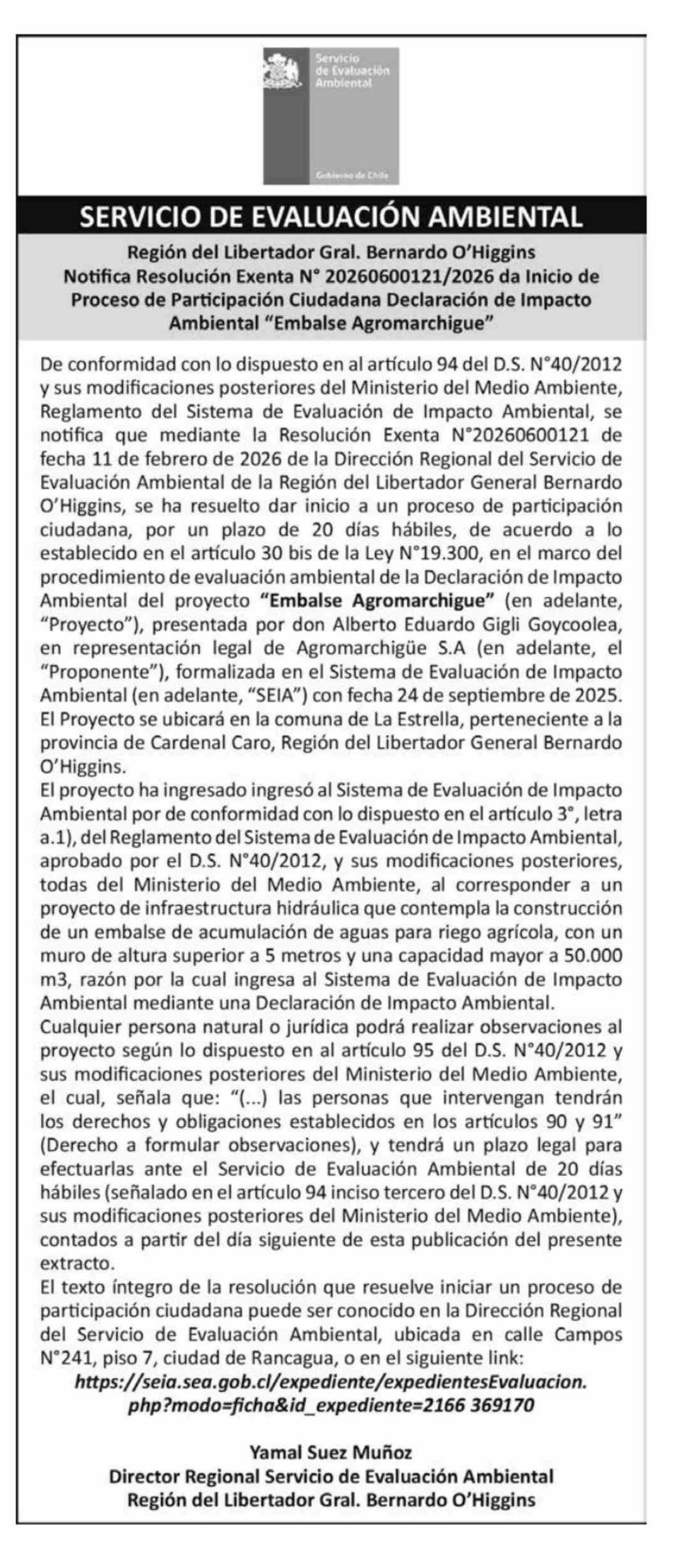 Fecha: 18-02-2026 Sector: Extractos Región: Región del Libertador General Bernardo O'Higgins