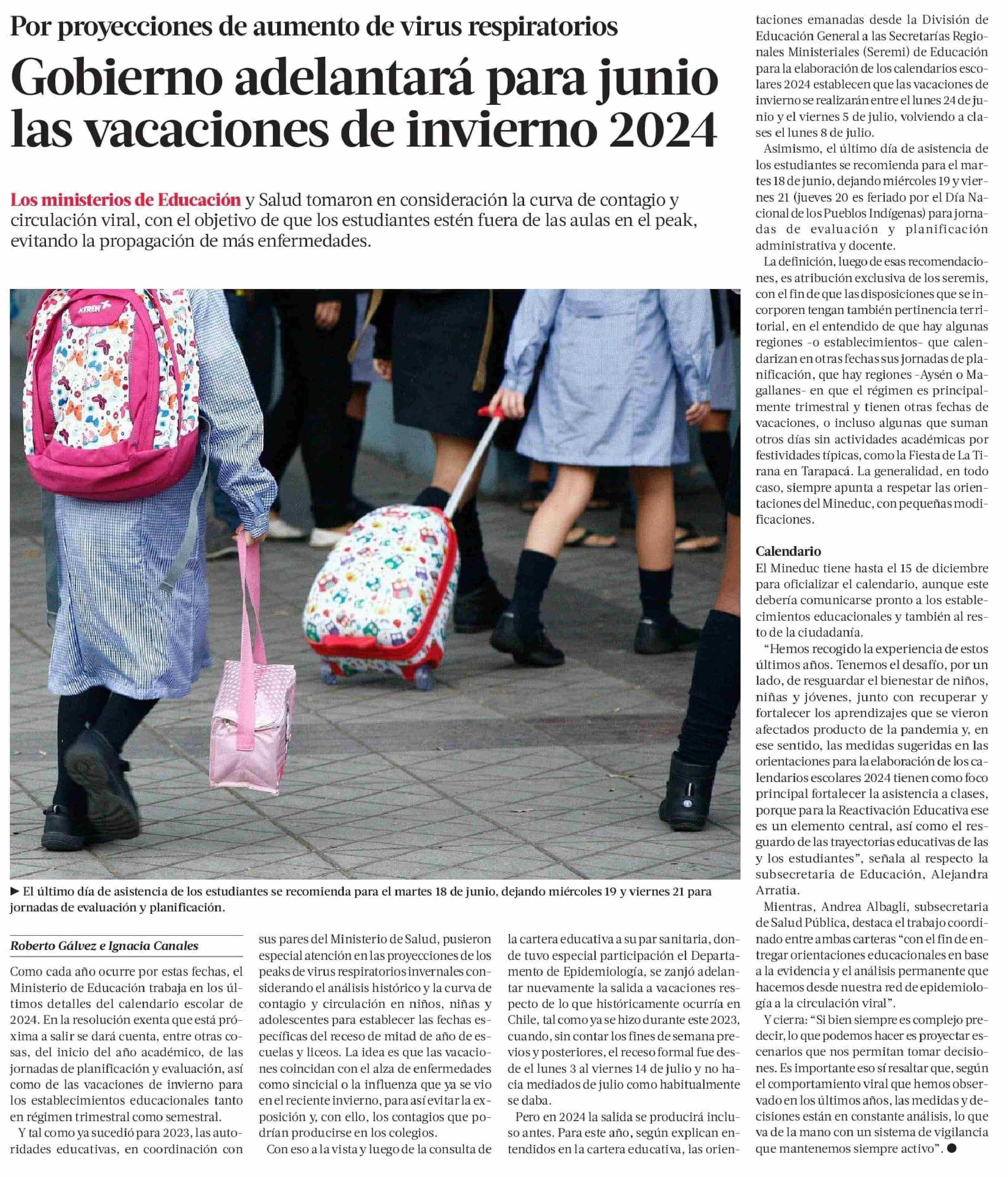Gobierno adelantará para junio las vacaciones de invierno 2024 04-12-2023 La Tercera |