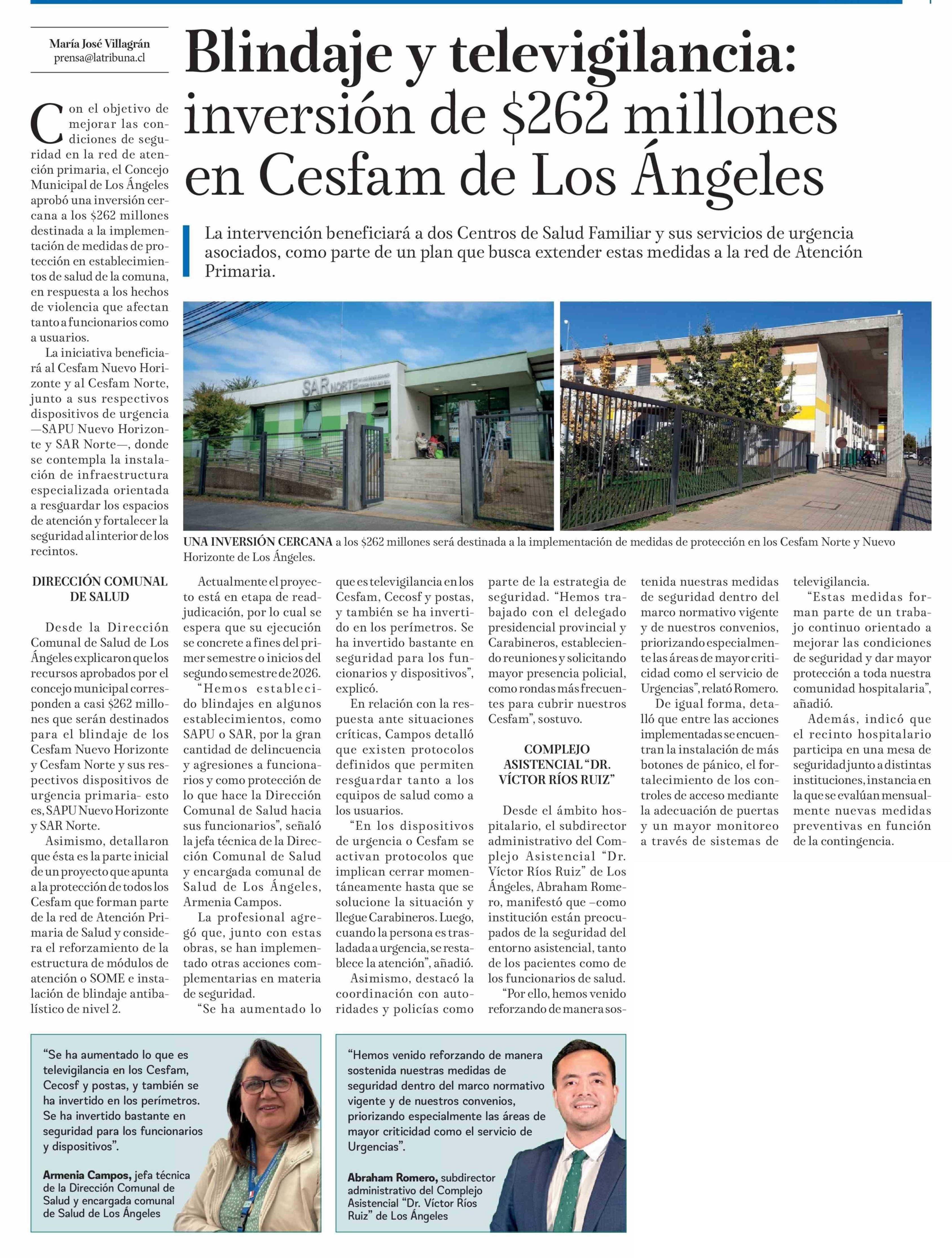 Blindaje y televigilancia: inversión de $262 millones en Cesfam de Los Ángeles 27-04-2026 La Tribuna |