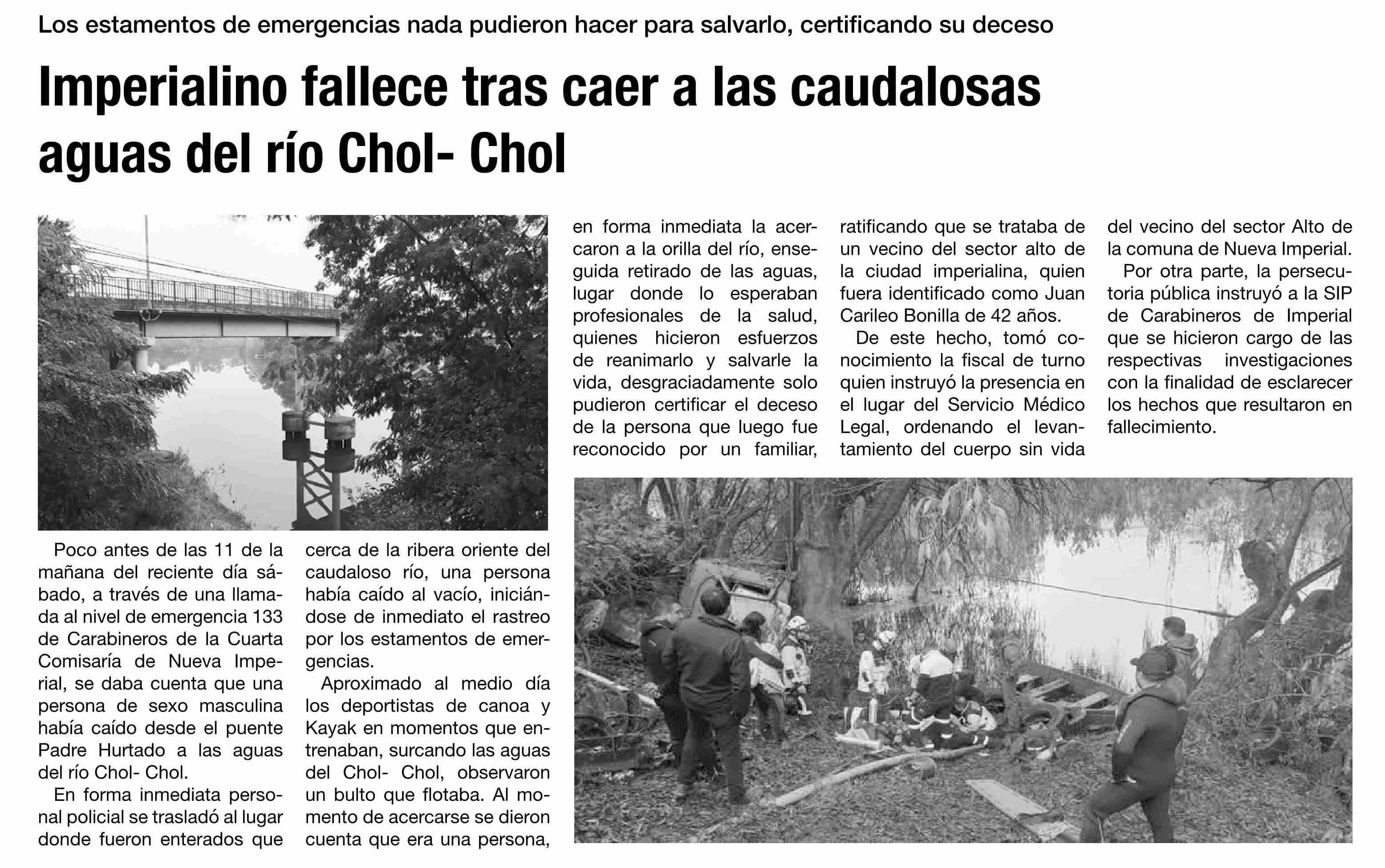 | Título: | Imperialino fallece tras caer a las caudalosas aguas del río Chol- Chol |