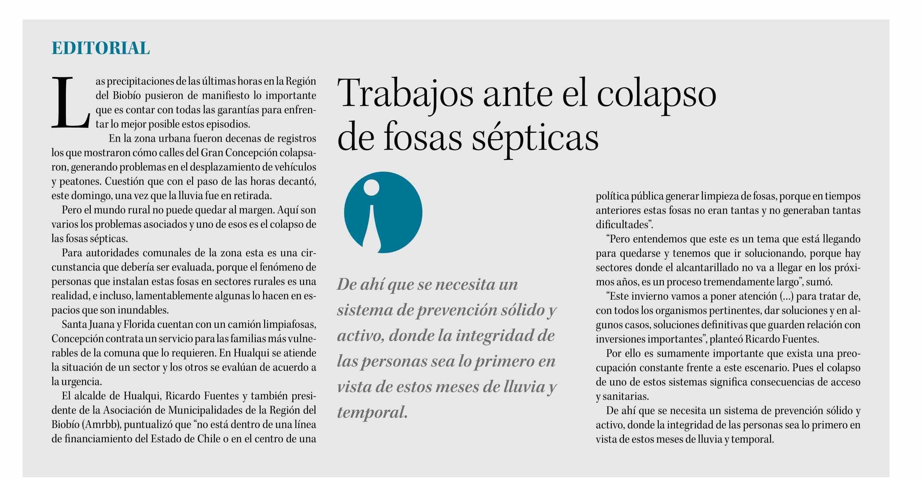 EDITORIAL: Trabajos ante el colapso de fosas sépticas 26-05-2025 Diario Concepción |