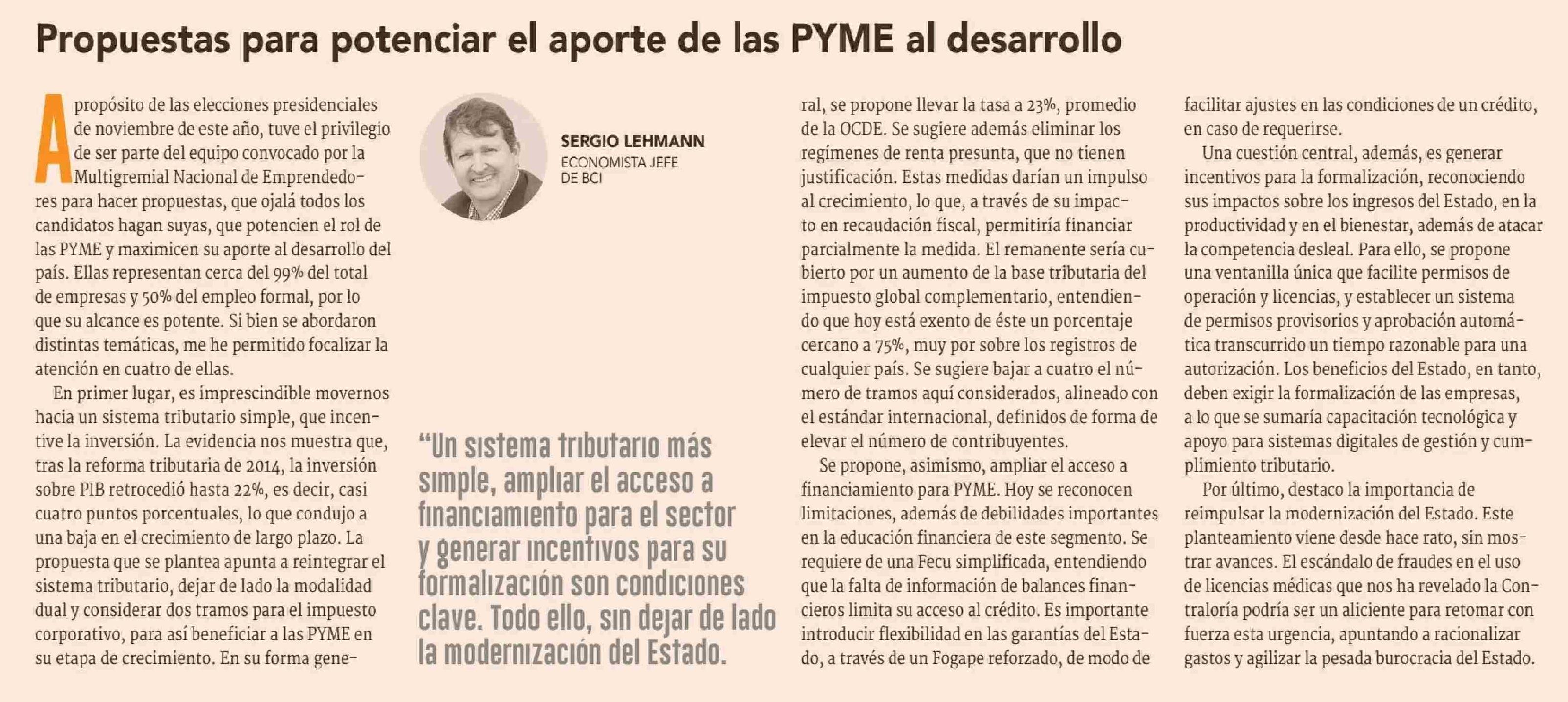COLUMNAS DE OPINIÓN: Propuestas para potenciar el aporte de las PYME al desarrollo 05-06-2025 Diario Financiero |
