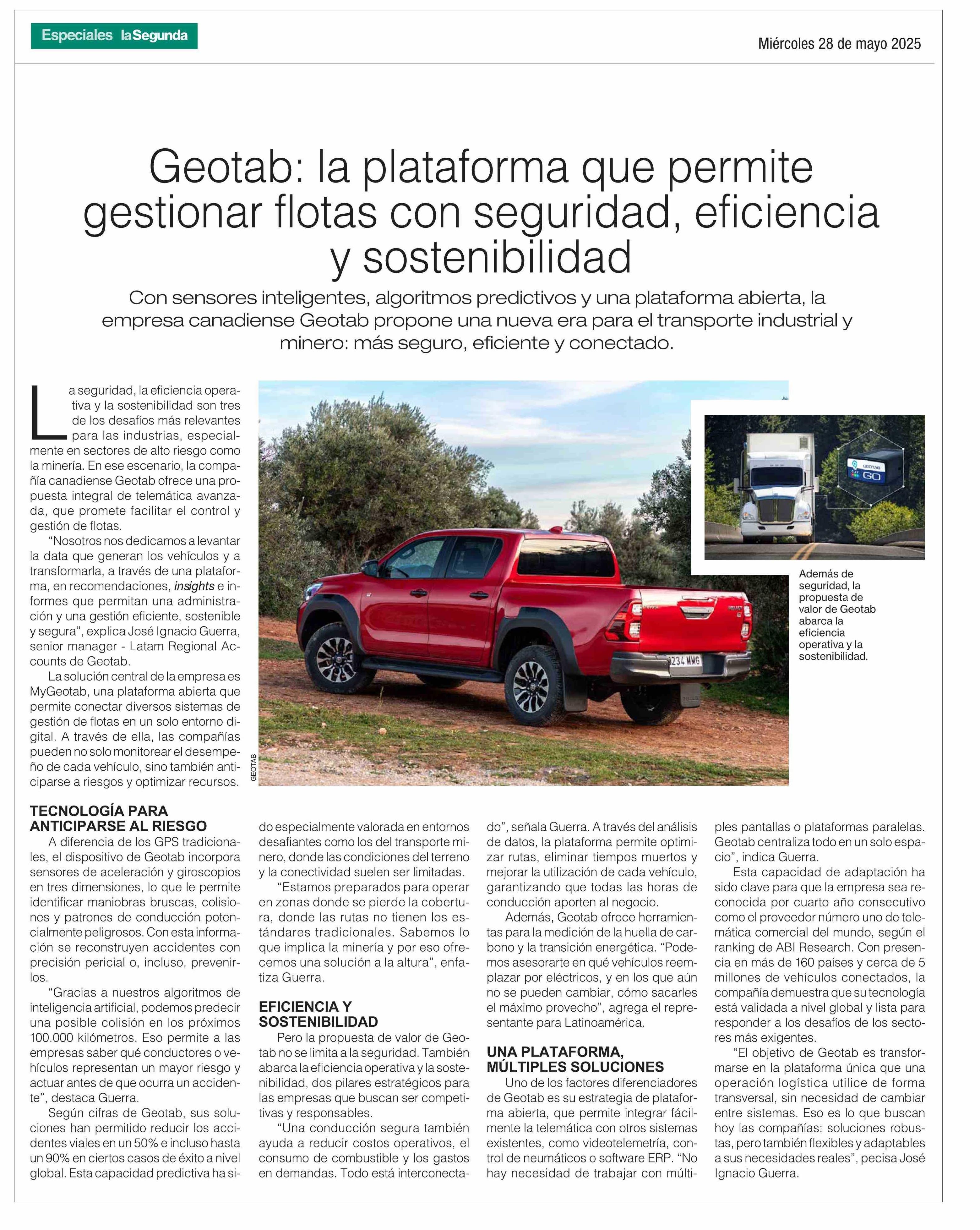 Geotab: la plataforma que permite gestionar flotas con seguridad, eficiencia y sostenibilidad 28-05-2025 La Segunda |