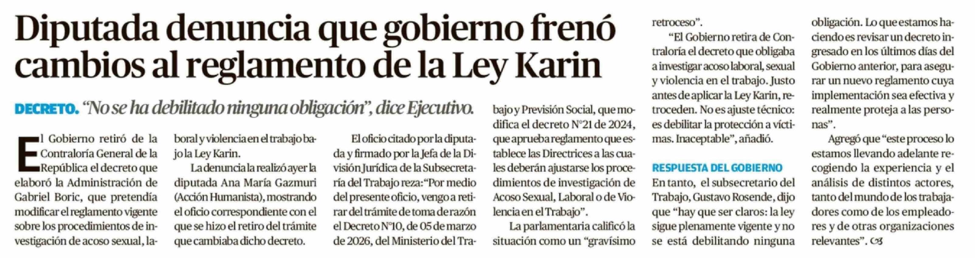 | Título: | Diputada denuncia que gobierno frenó cambios al reglamento de la Ley Karin |