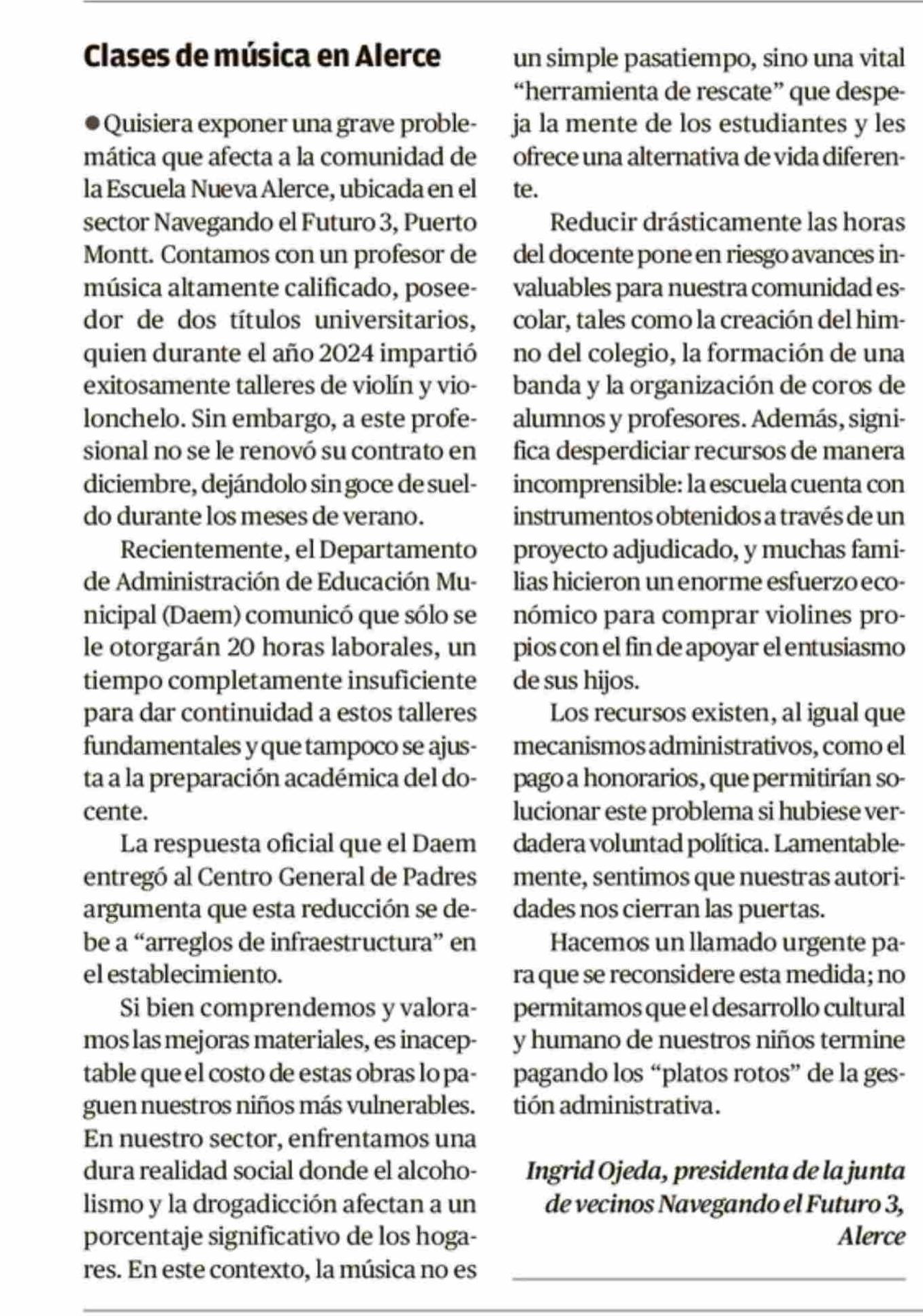 CARTAS: Clases de música en Alerce 23-04-2026 El Llanquihue |