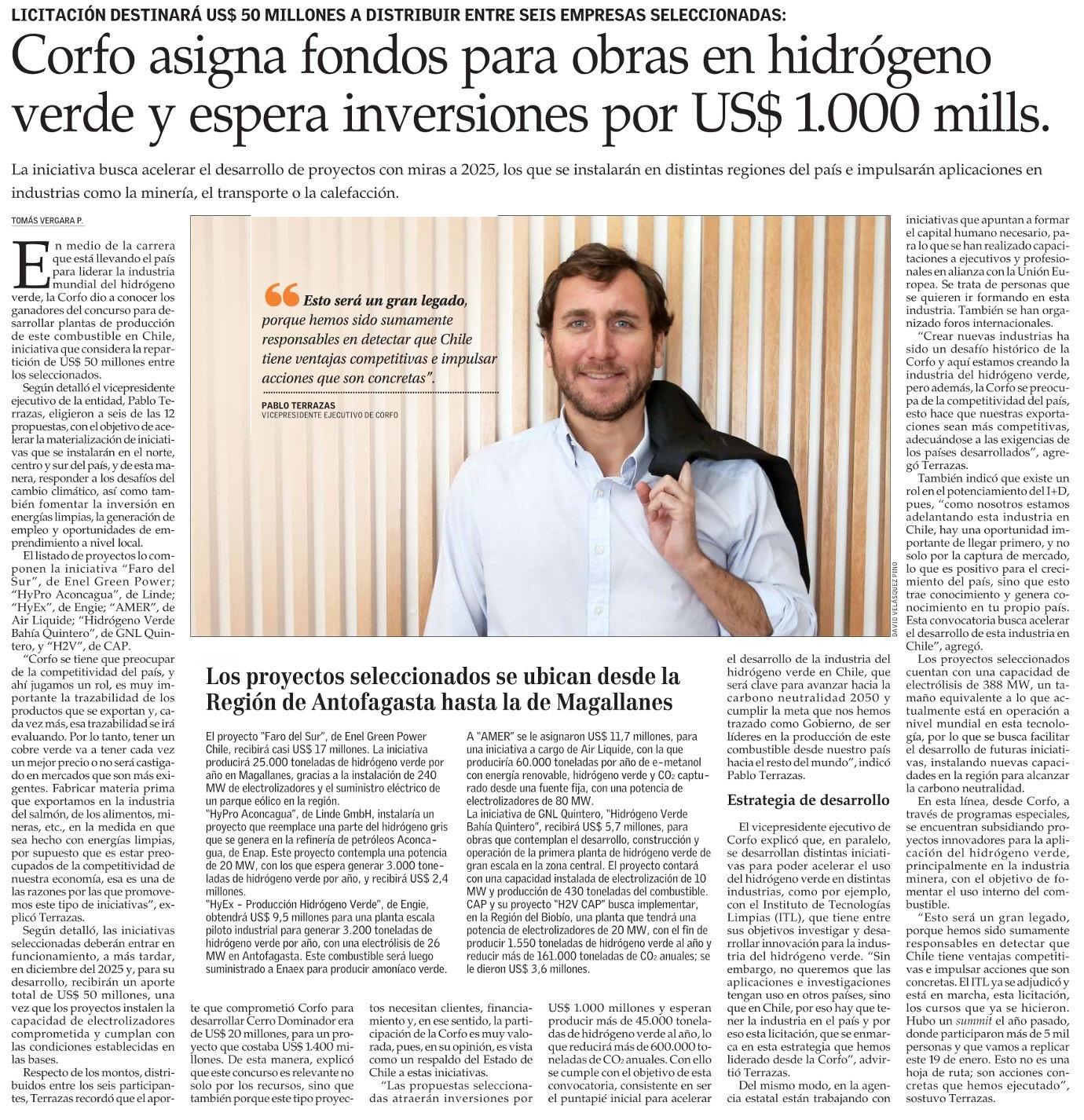 | Título: | Corfo asigna fondos para obras en hidrógeno verde y espera inversiones por US$ 1.000 mills. |