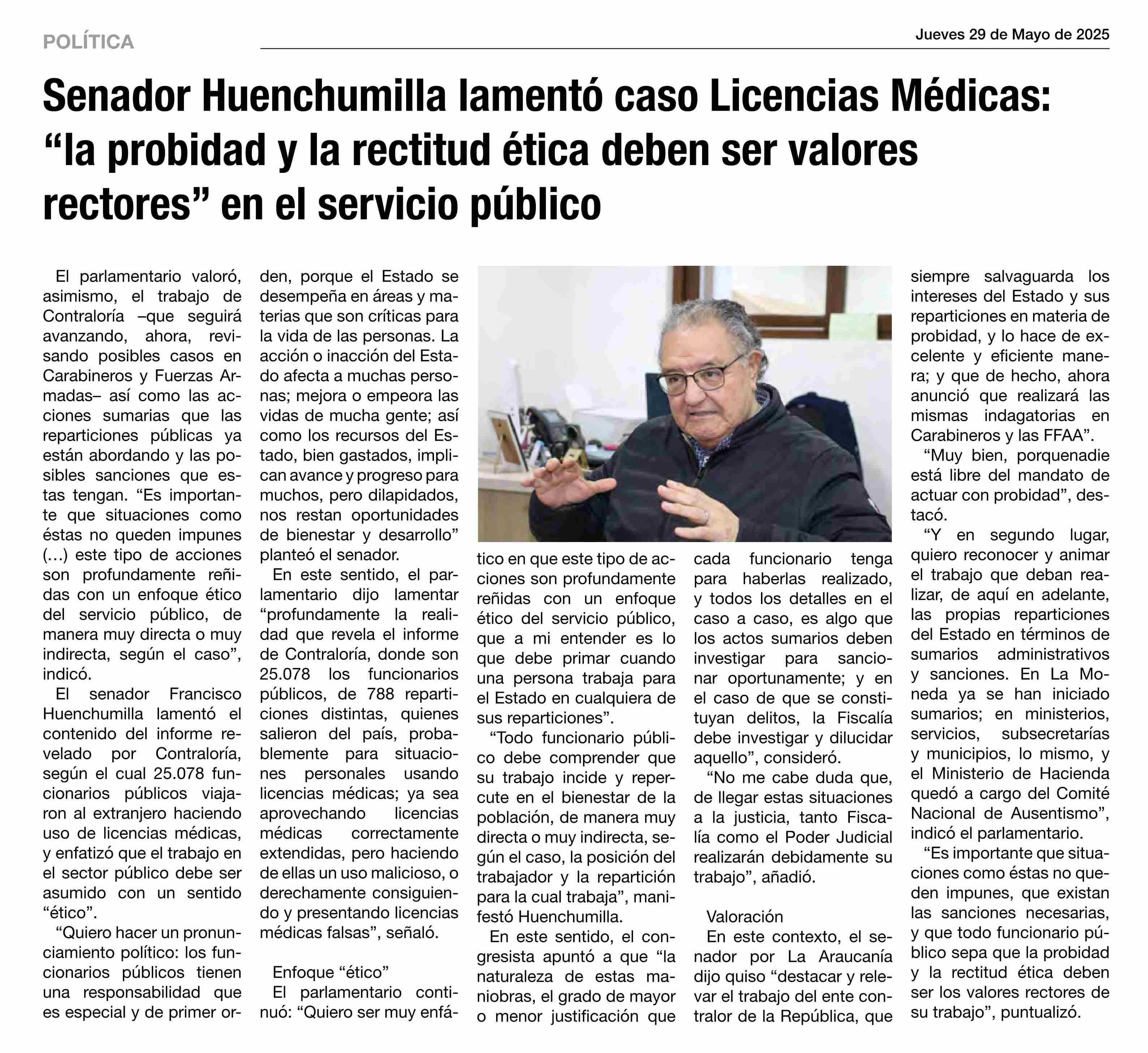 Senador Huenchumilla lamentó caso Licencias Médicas: “la probidad y la rectitud ética deben ser valores rectores” en el servicio público 29-05-2025 El Informador |