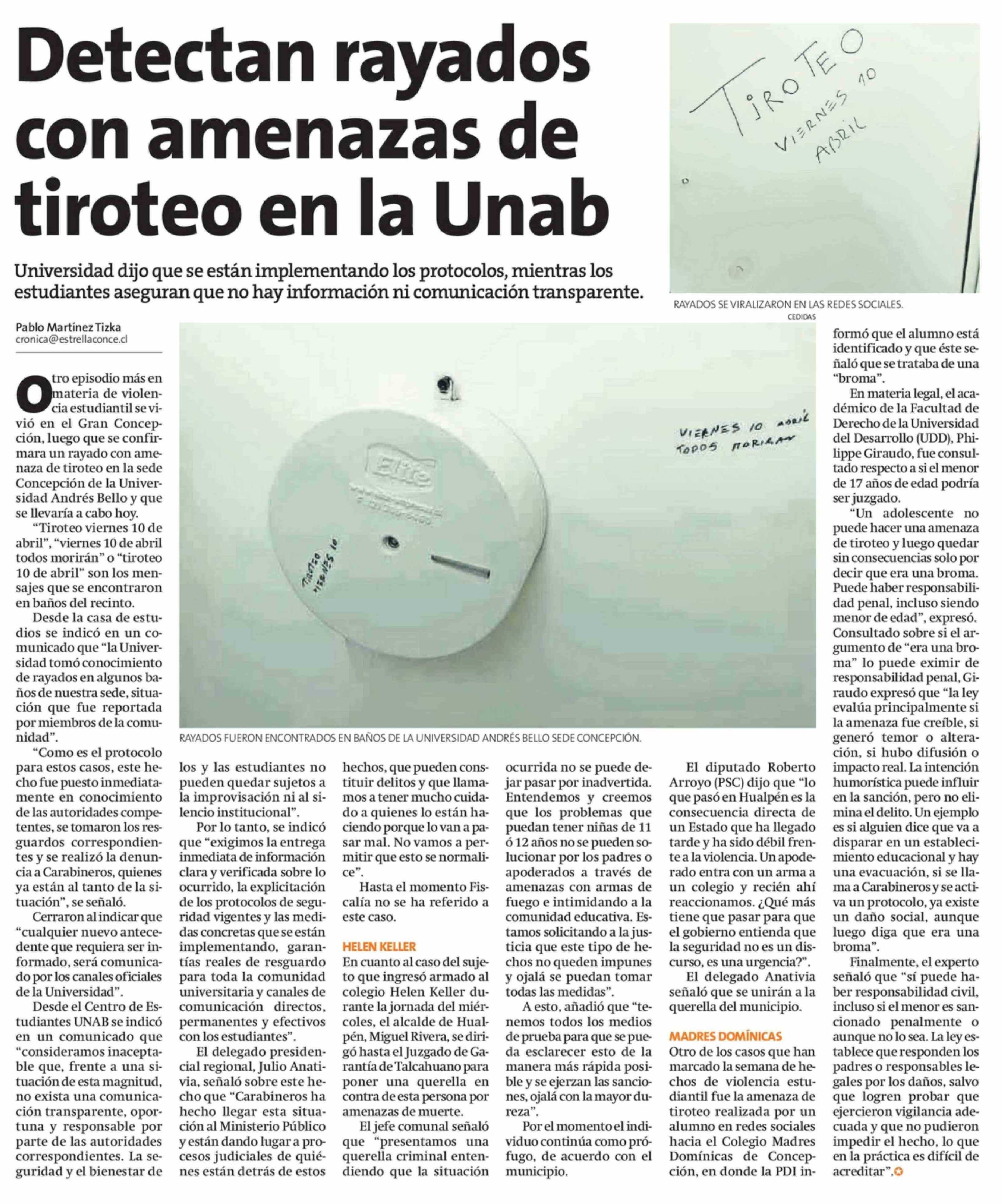 Detectan rayados con amenazas de tiroteo en la Unab 10-04-2026 La Estrella de Concepción |