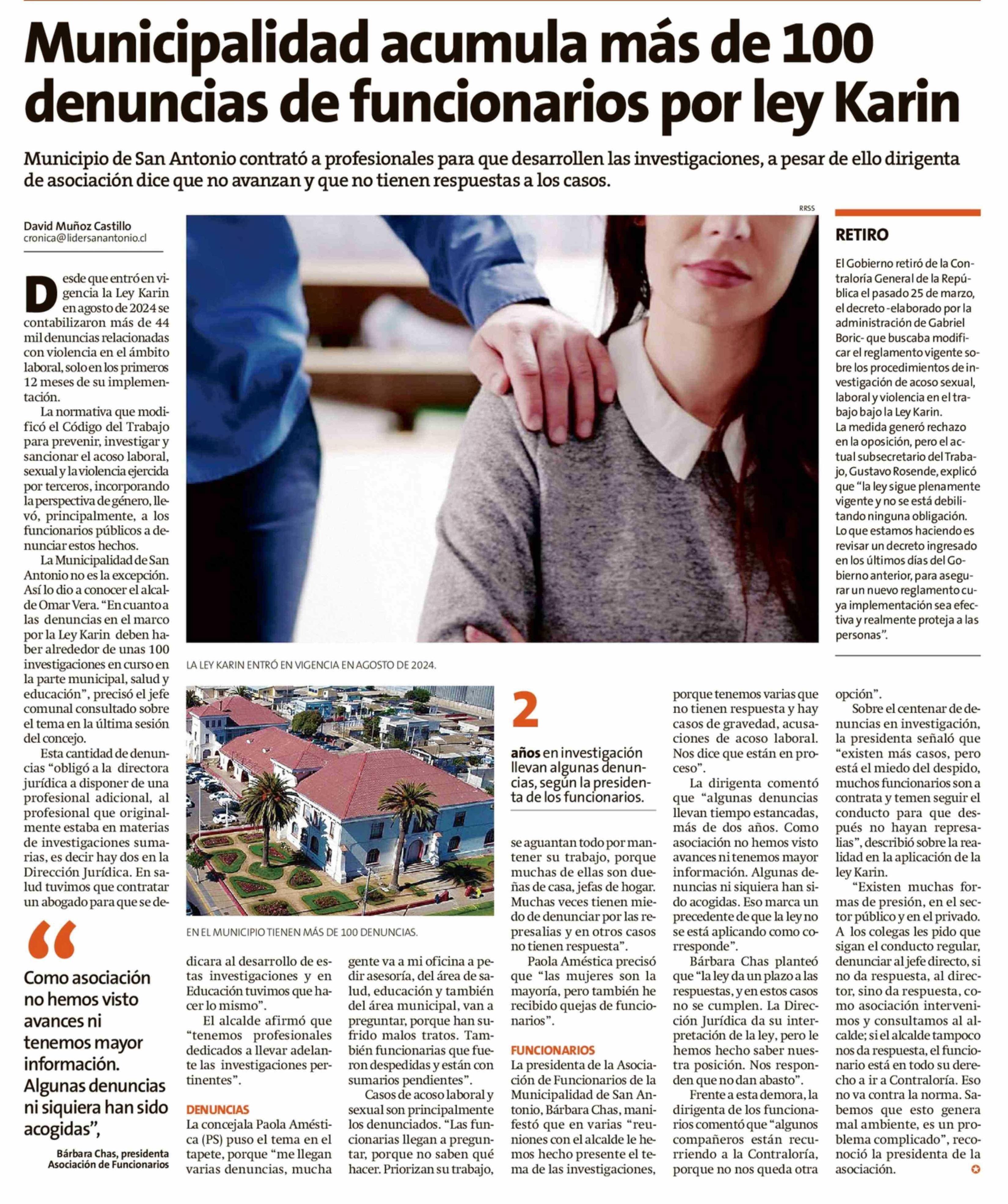 Título: Municipalidad acumula más de 100 denuncias de funcionarios por ley Karin