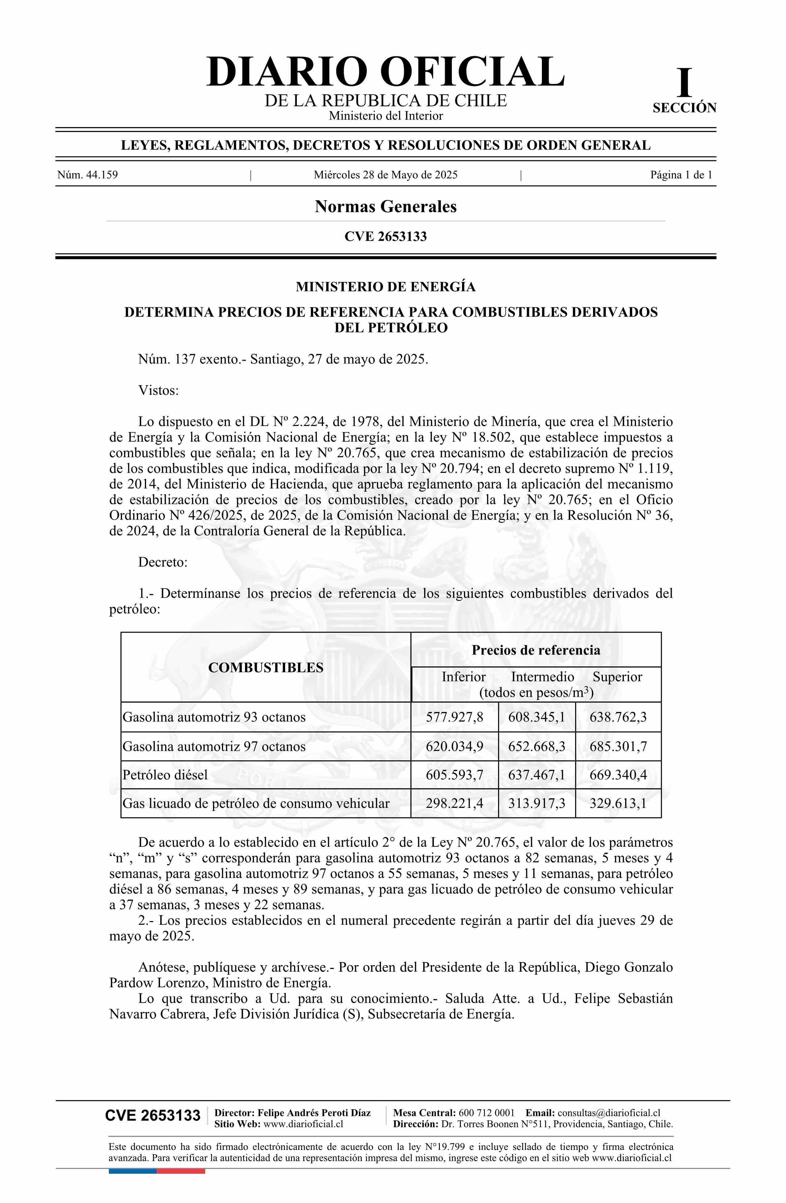 Decreto exento número 137, de 2025.- Determina precios de referencia para combustibles derivados del petróleo 28-05-2025 DIARIO OFICIAL CHILE - BOLETÍN OFICIAL DE MINERÍA |