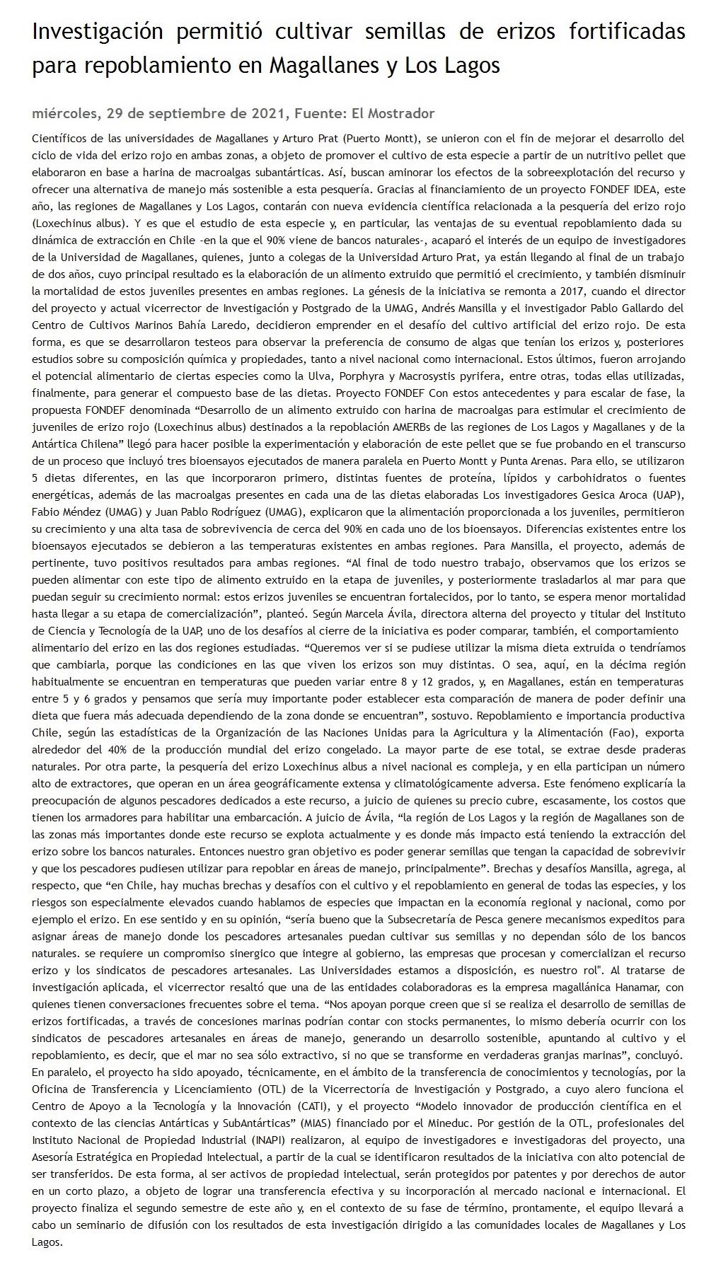 Investigación permitió cultivar semillas de erizos fortificadas para repoblamiento en Magallanes y Los Lagos 29-09-2021 El Mostrador (Stgo - Chile) |