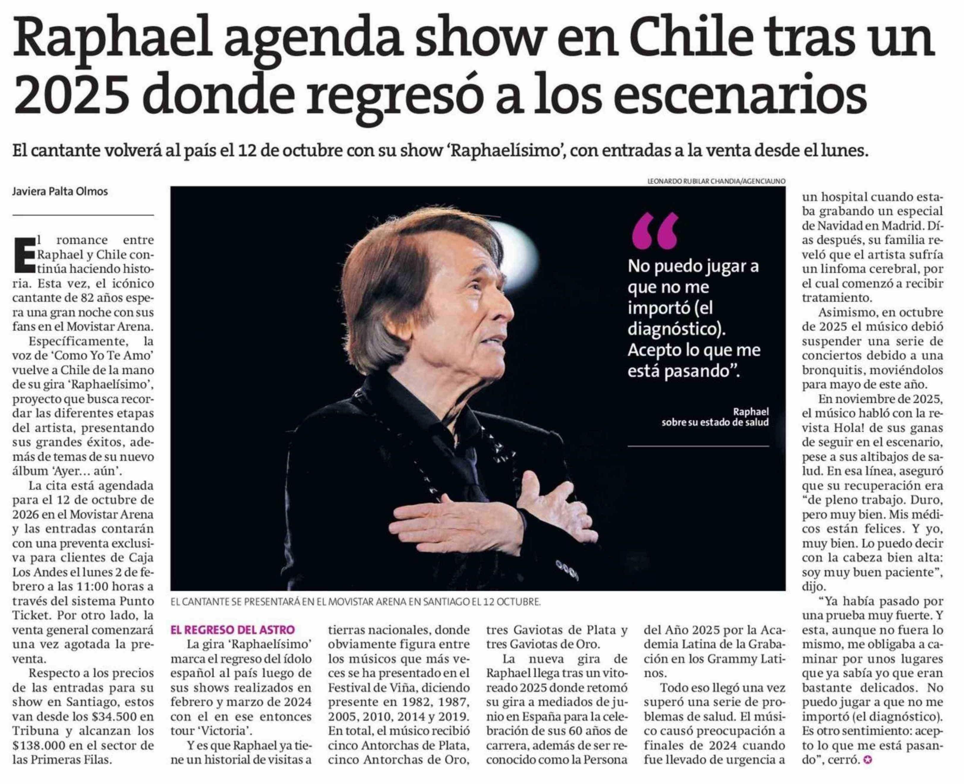 Título: Raphael agenda show en Chile tras un 2025 donde regresó a los escenarios