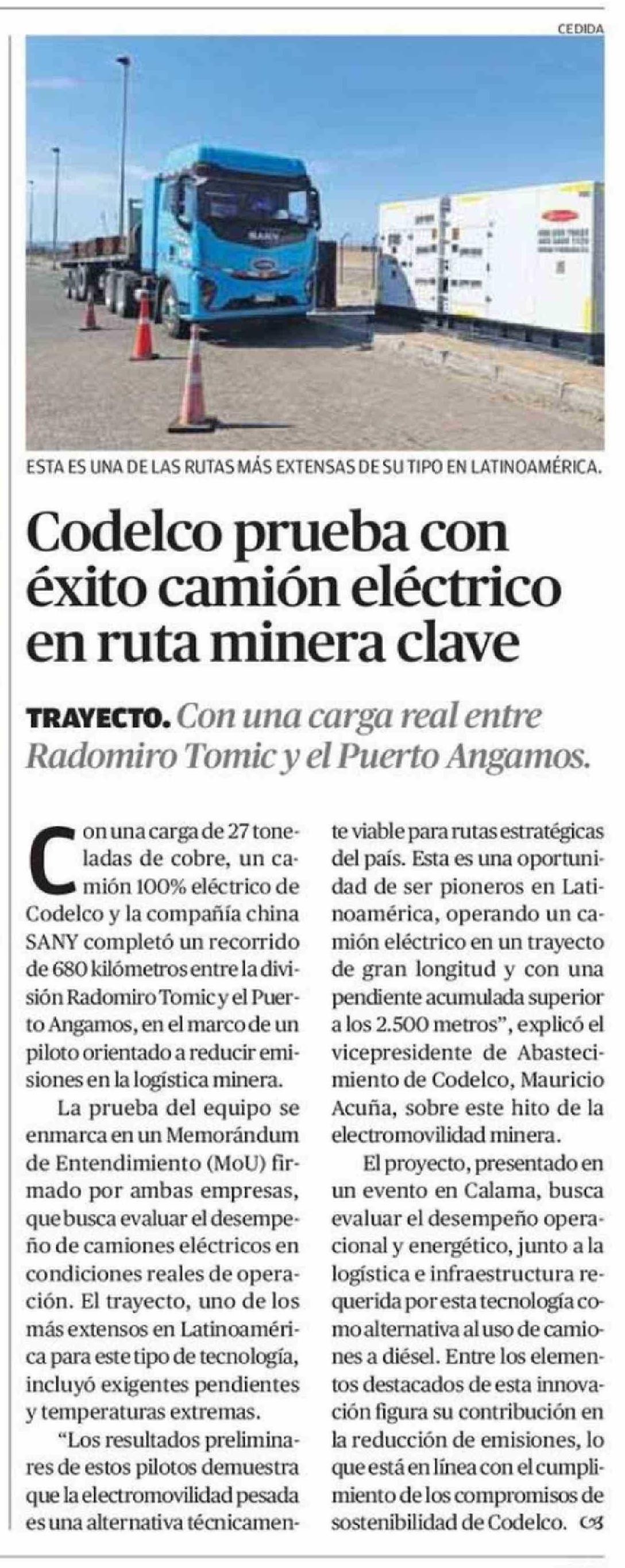 Codelco prueba con éxito camión eléctrico en ruta minera clave 10-04-2026 El Mercurio de Calama |