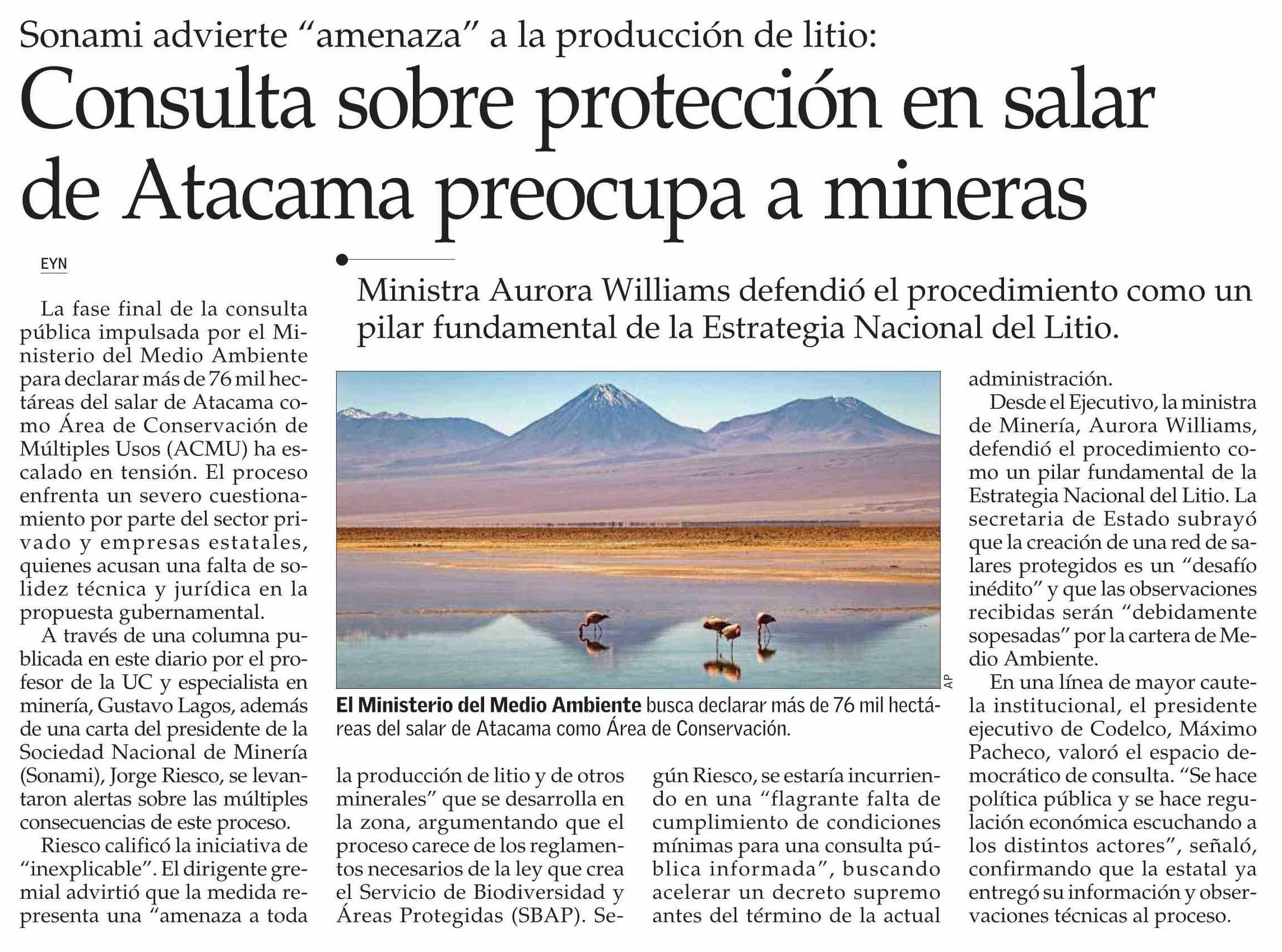 Consulta sobre protección en salar de Atacama preocupa a mineras 13-02-2026 El Mercurio |