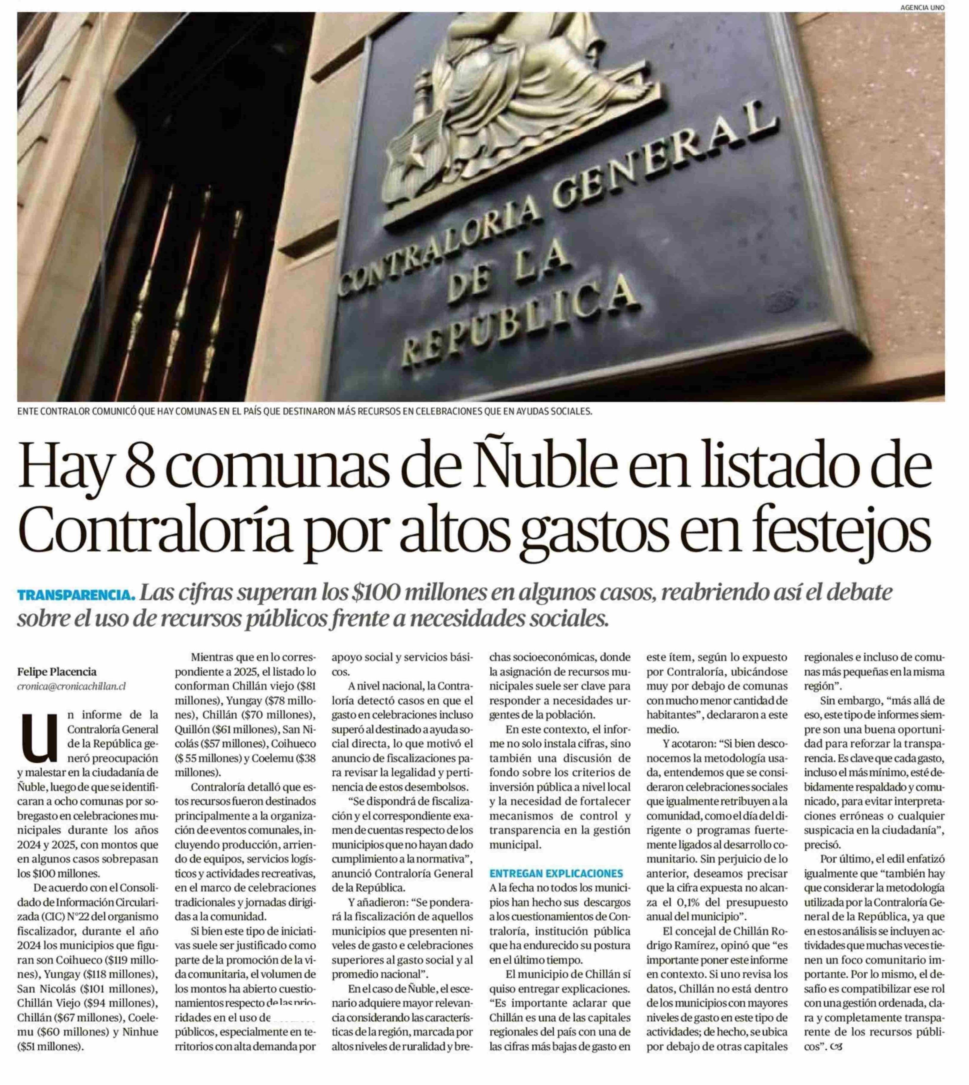 Hay 8 comunas de Ñuble en listado de Contraloría por altos gastos en festejos 27-04-2026 Crónica de Chillán |