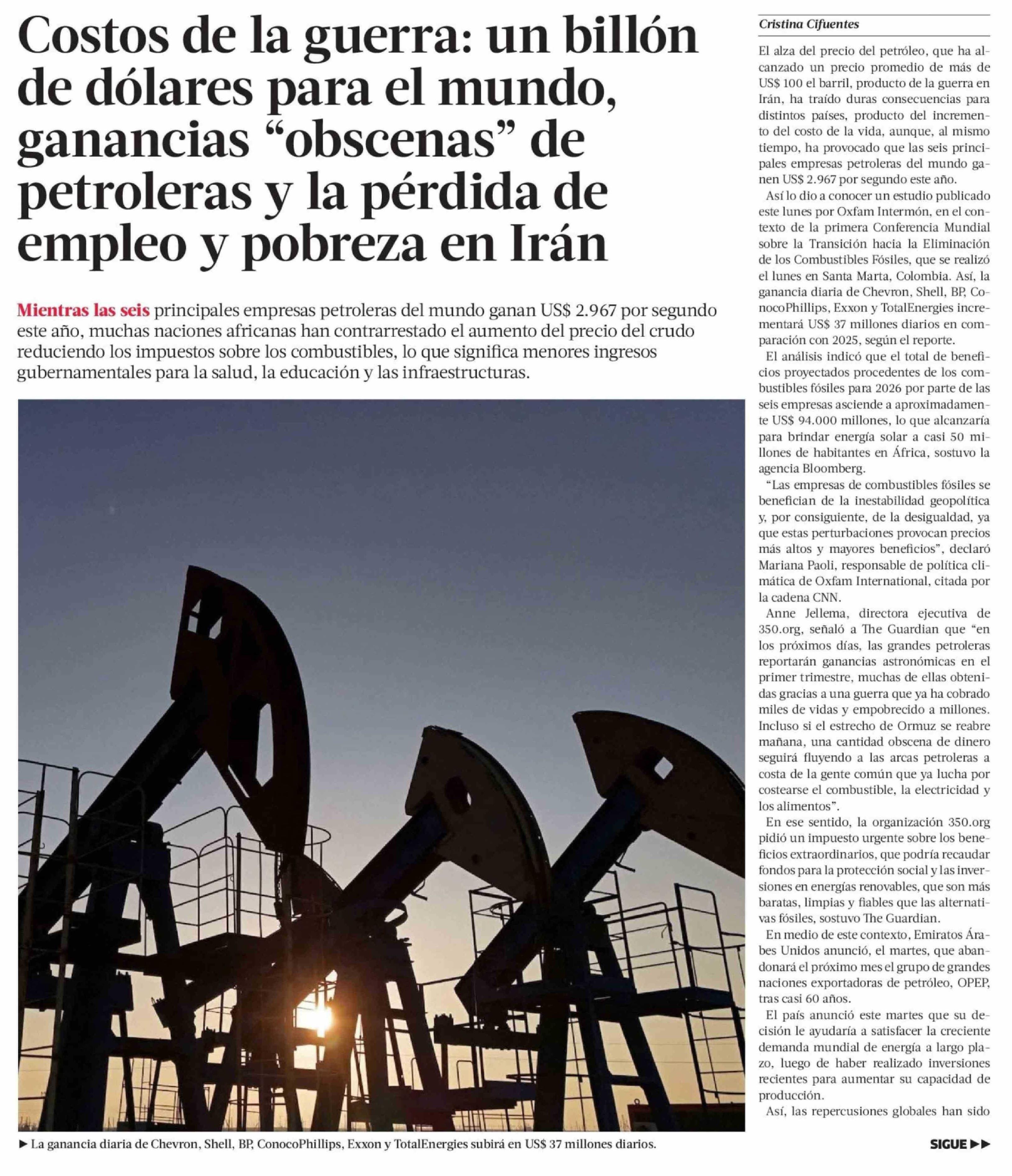 Costos de la guerra: un billón de dólares para el mundo, ganancias "obscenas" de petroleras y la pérdida de empleo y pobreza en Irán 29-04-2026 La Tercera |