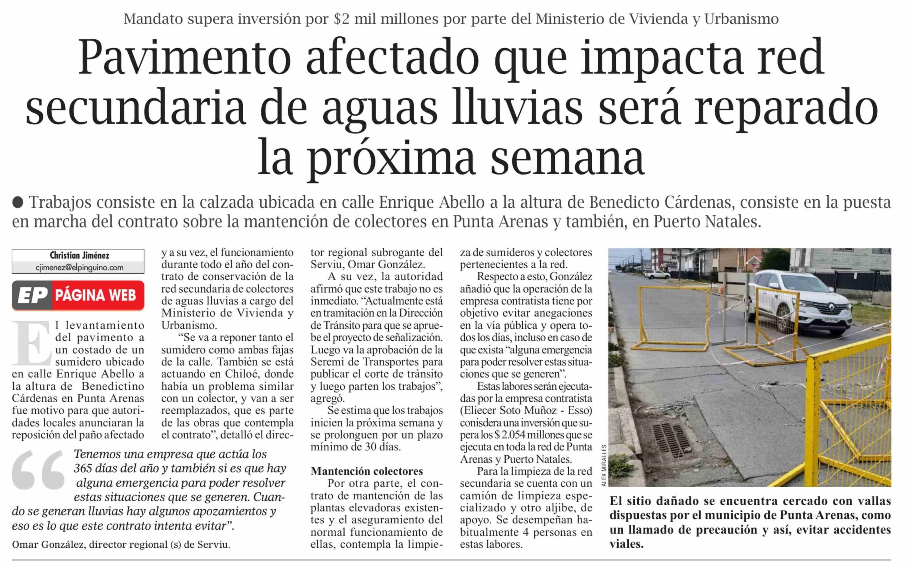 Pavimento afectado que impacta red secundaria de aguas lluvias será reparado la próxima semana 12-02-2026 El Pingüino |