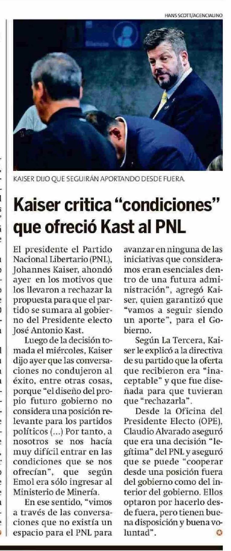 Título: Kaiser critica "condiciones" que ofreció Kast al PNL
