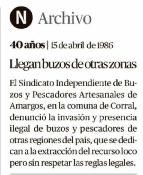 Título: 40 años | 15 de abril de 1986 Llegan buzos de otras zonas El Sindicato Independiente de Buzos y Pescadores Artesanales de Amargos, en la comuna de Corral, denunció la invasión y presencia ilegal de buzos y pescadores de otras regiones del país, que se dedican a la extracción del recurso loco pero si