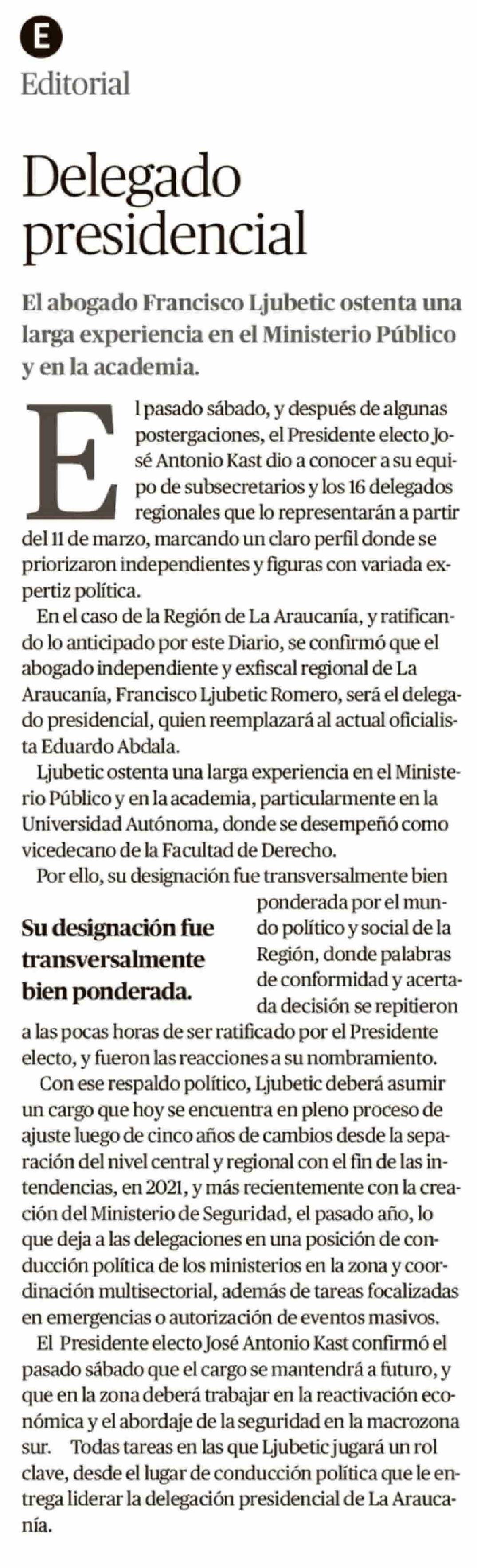 Editorial: Delegado presidencial 12-02-2026 El Austral de la Araucanía |