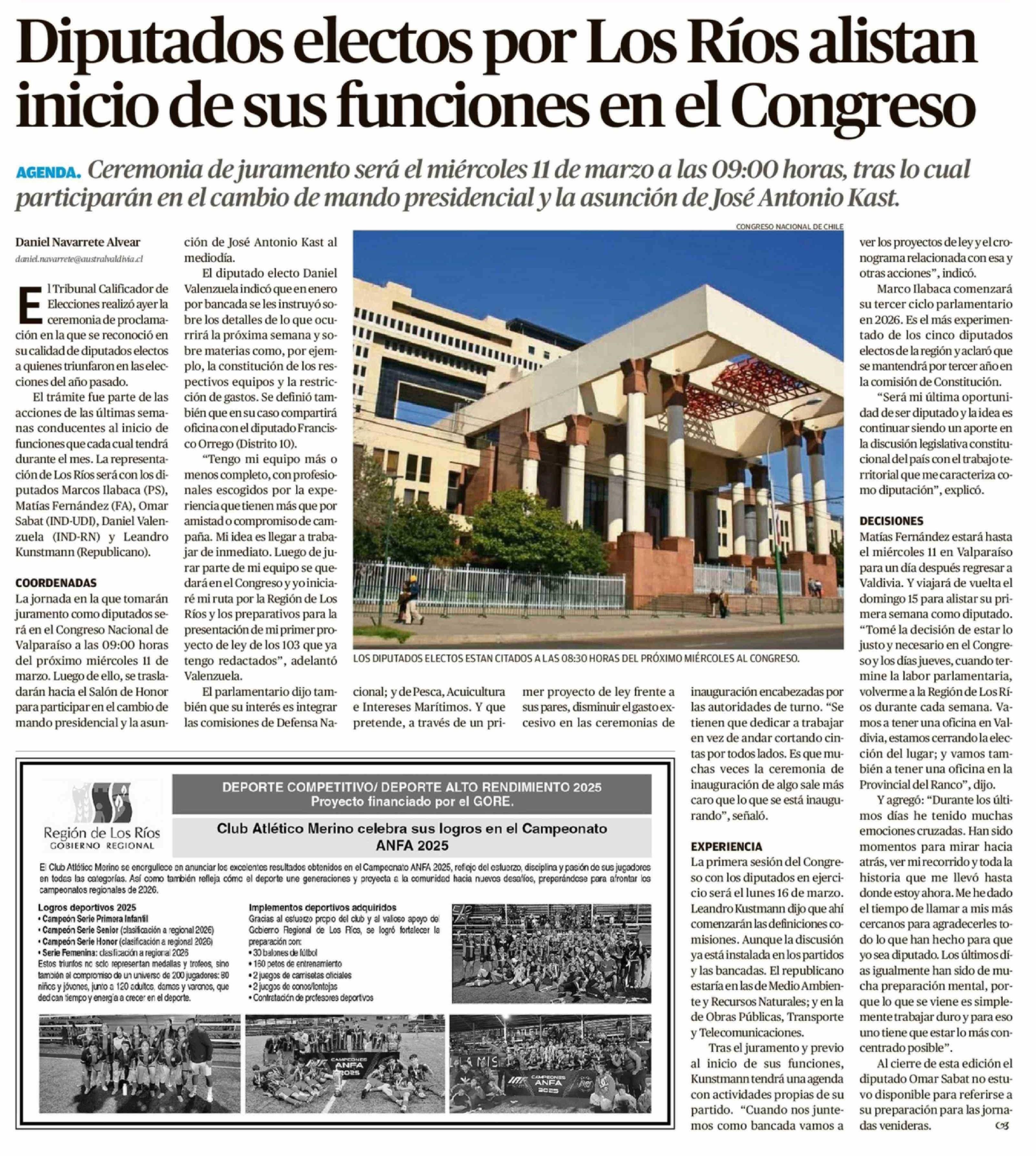 Diputados electos por Los Ríos alistan inicio de sus funciones en el Congreso 06-03-2026 Diario Austral Región de Los Ríos |