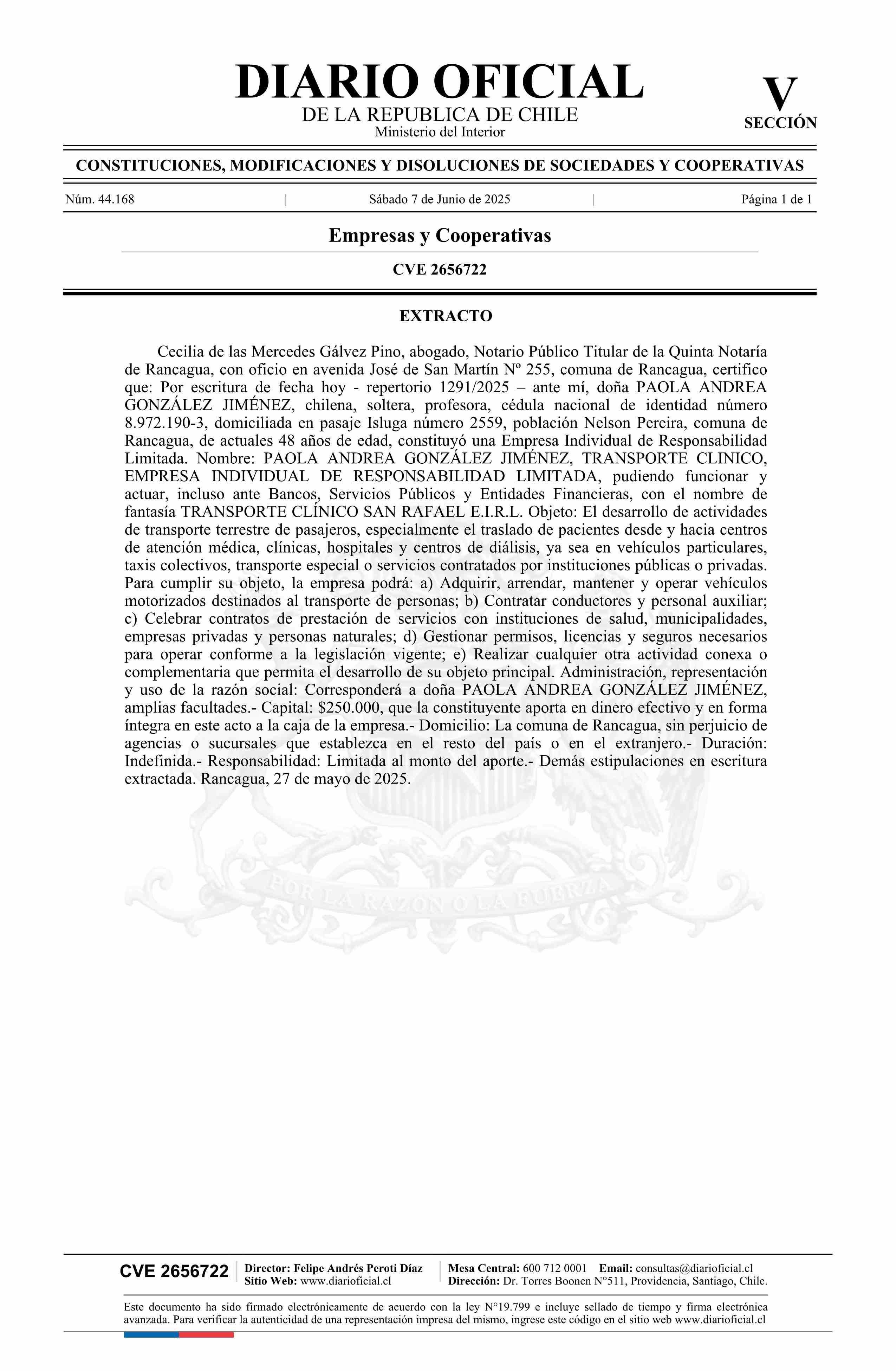 PAOLA ANDREA GONZÁLEZ JIMÉNEZ, TRANSPORTE CLINICO, EMPRESA INDIVIDUAL DE RESPONSABILIDAD LIMITADA 07-06-2025 Diario Oficial Edición Electrónica |