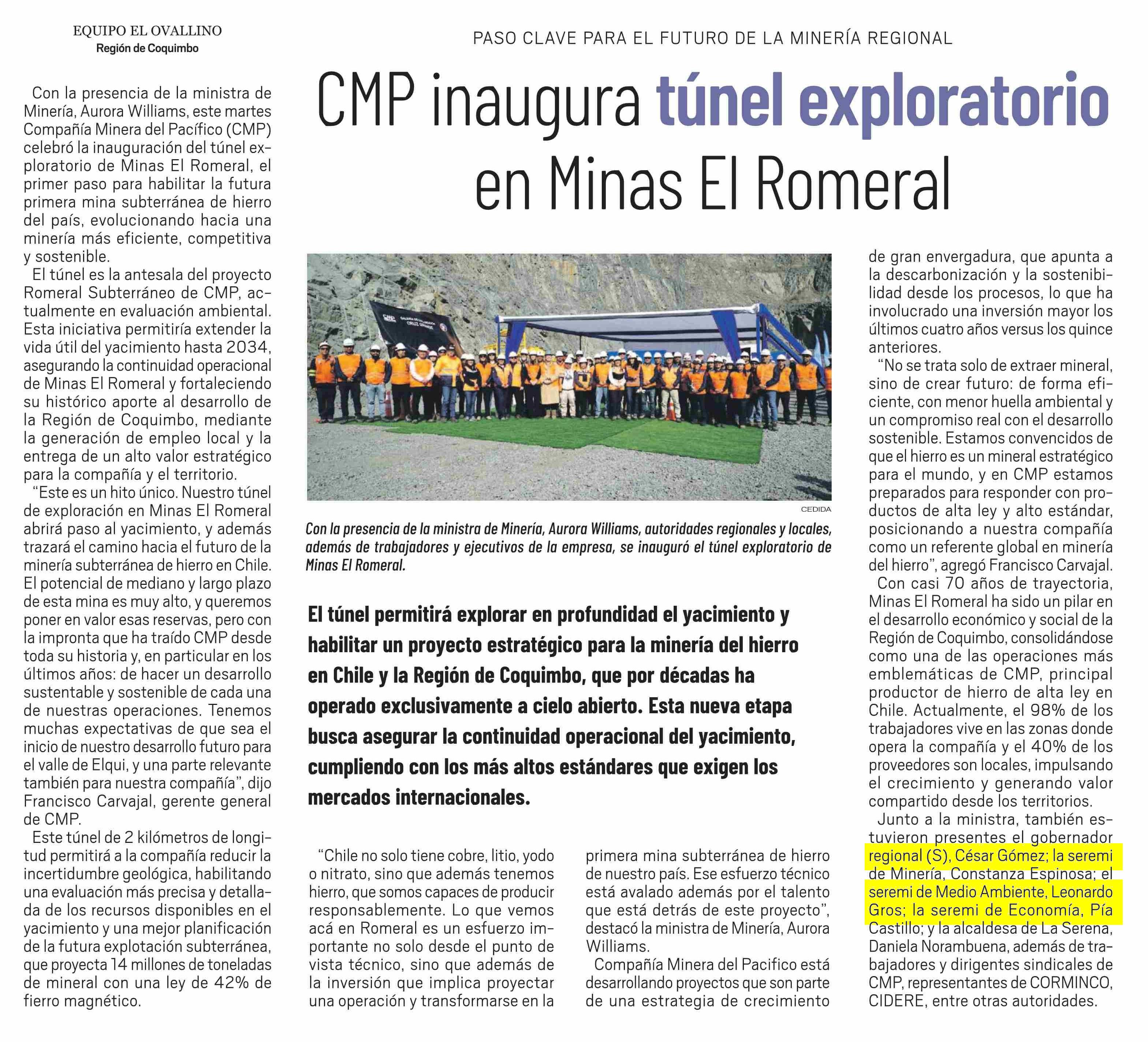 CMP inaugura túnel exploratorio en Minas El Romeral