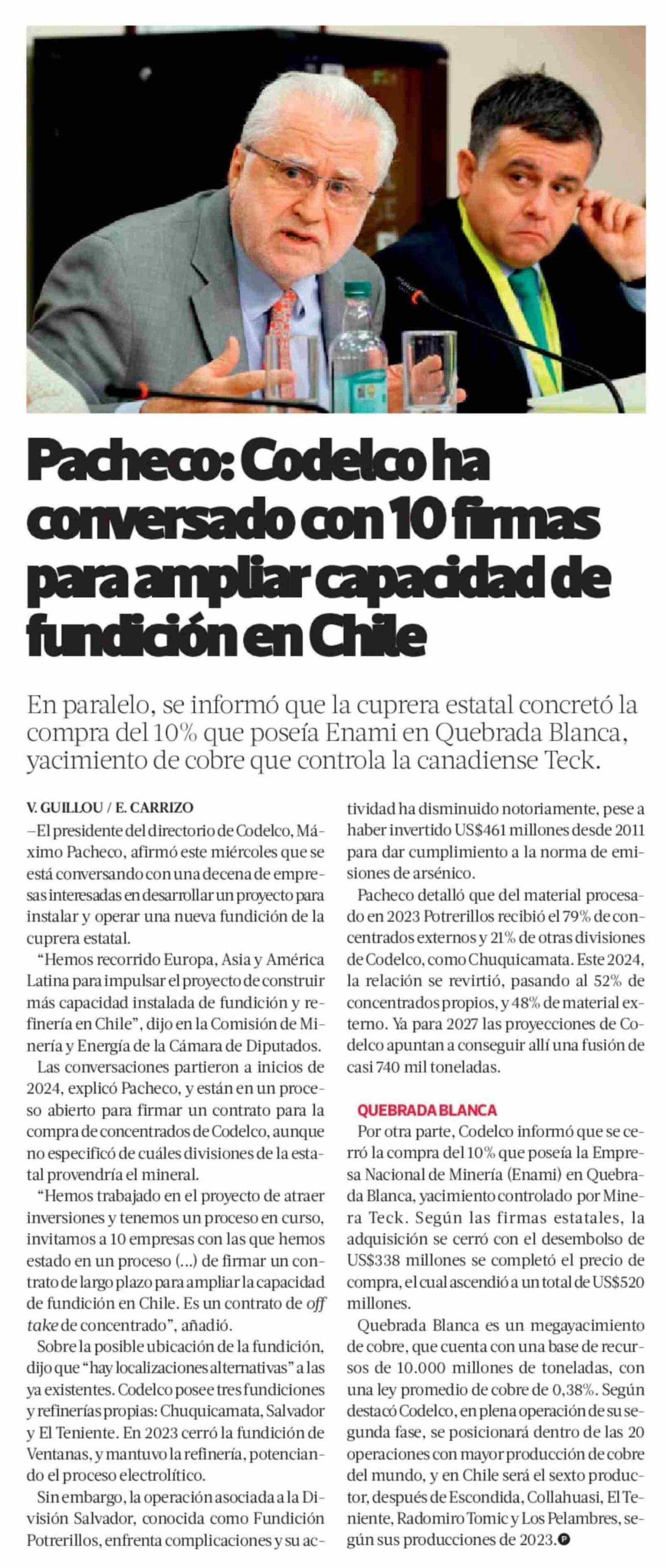 Pacheco: Codelco ha conversado con 10 firmas para ampliar capacidad de fundición en Chile 19-12-2024 La Tercera |