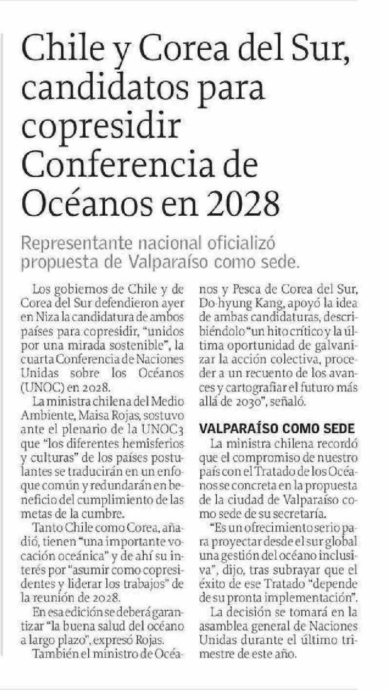 | Título: | Chile y Corea del Sur, candidatos para copresidir Conferencia de Océanos en 2028 |