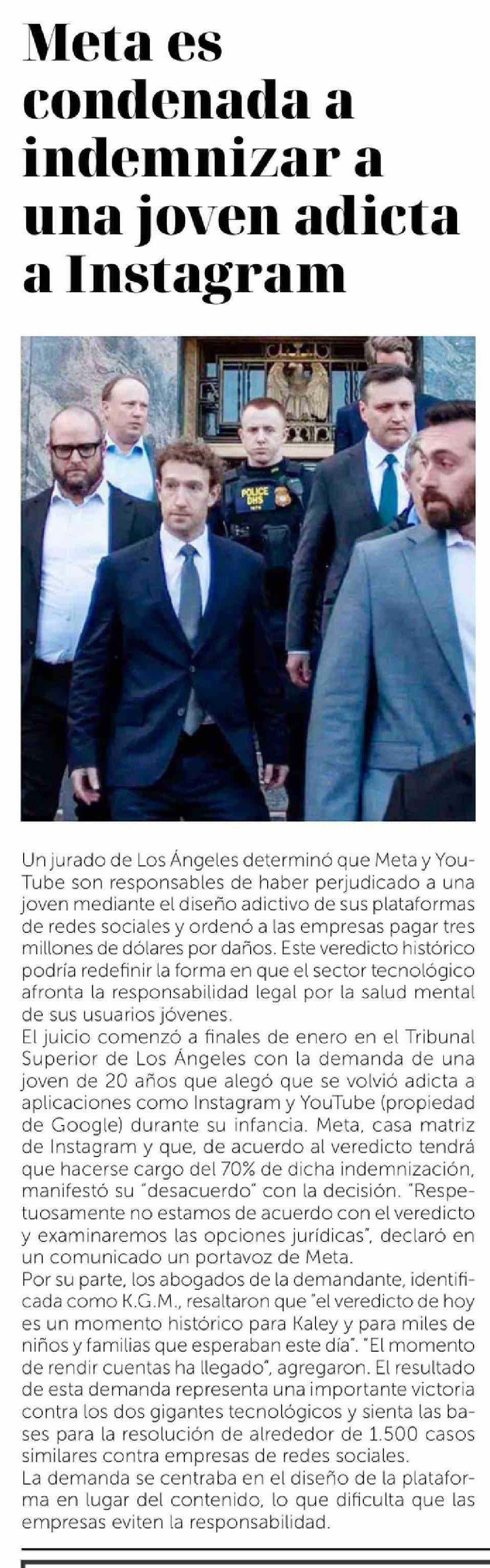 Meta es condenada a indemnizar a una joven adicta a Instagram 27-03-2026 La Discusión |