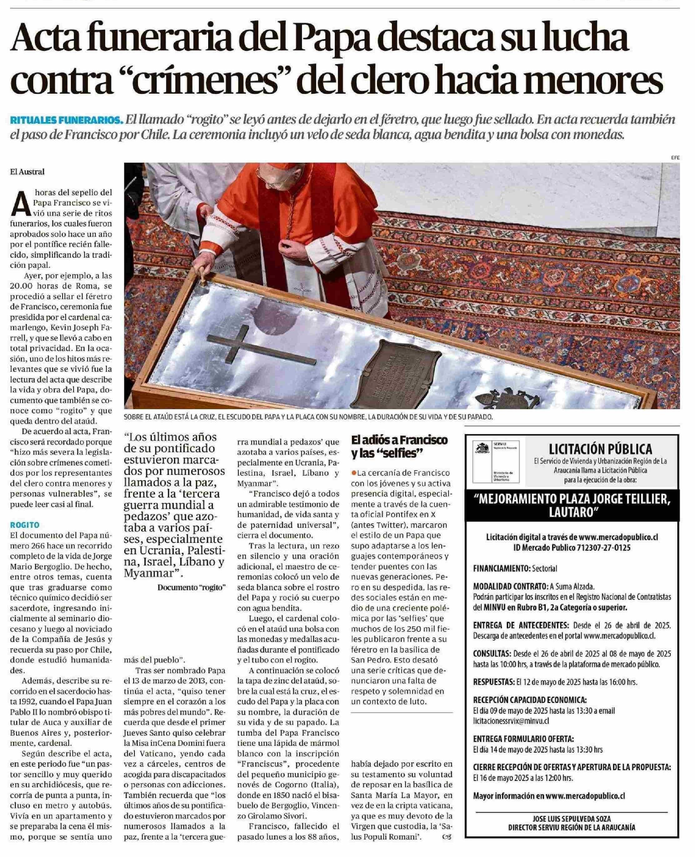 Acta funeraria del Papa destaca su lucha contra “crímenes” del clero hacia menores 26-04-2025 El Austral de la Araucanía |