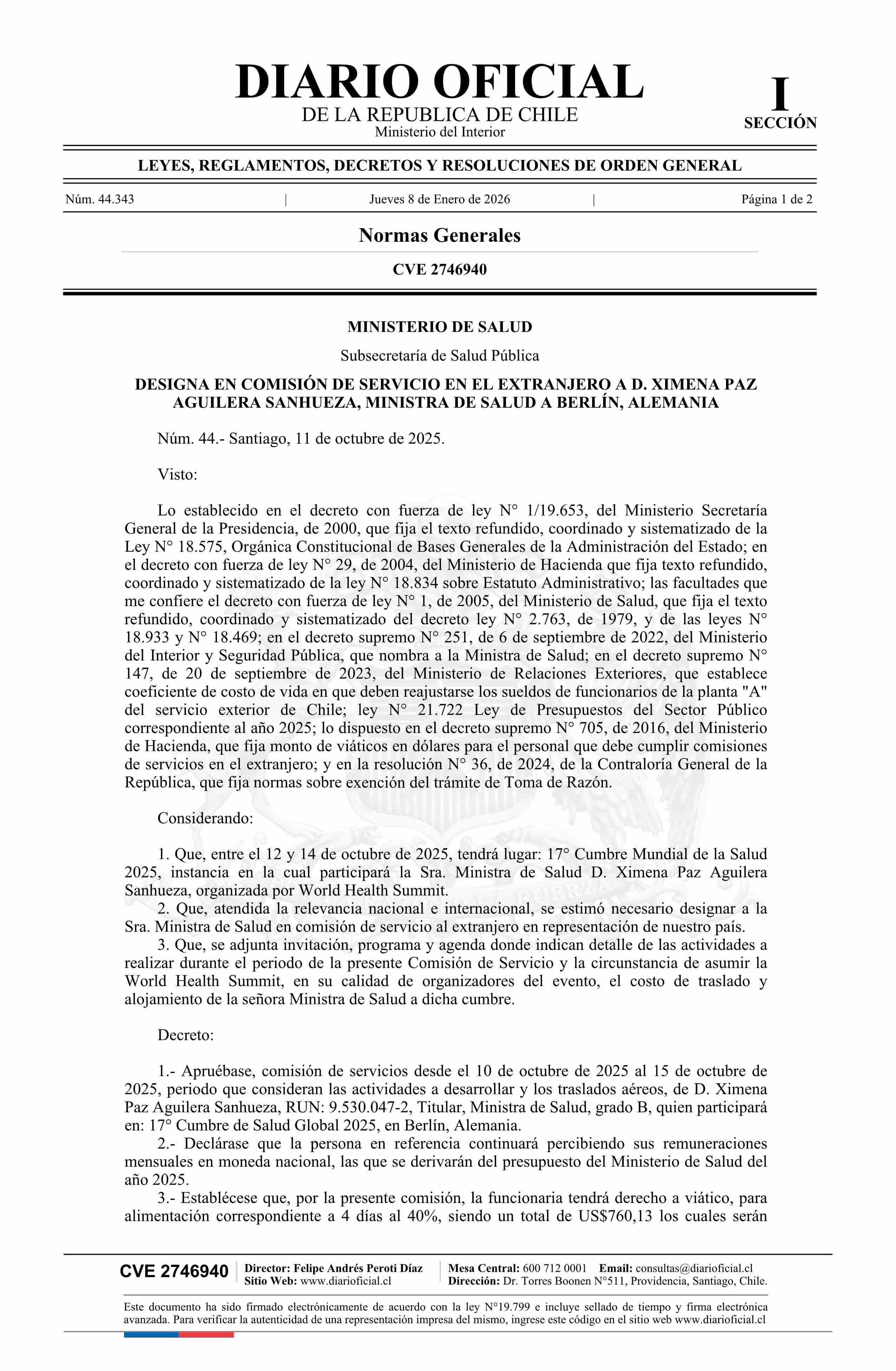 Decreto número 44, de 2025.- Designa a doña Ximena Paz Aguilera Sanhueza, Ministra de Salud, en comisión de servicio en el extranjero a Berlín, Alemania 08-01-2026 DIARIO OFICIAL CHILE - BOLETÍN OFICIAL DE MINERÍA |