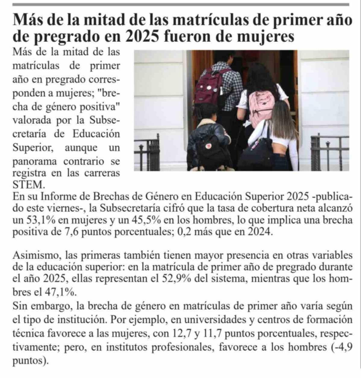 | Título: | Más de la mitad de las matrículas de primer año de pregrado en 2025 fueron de mujeres |