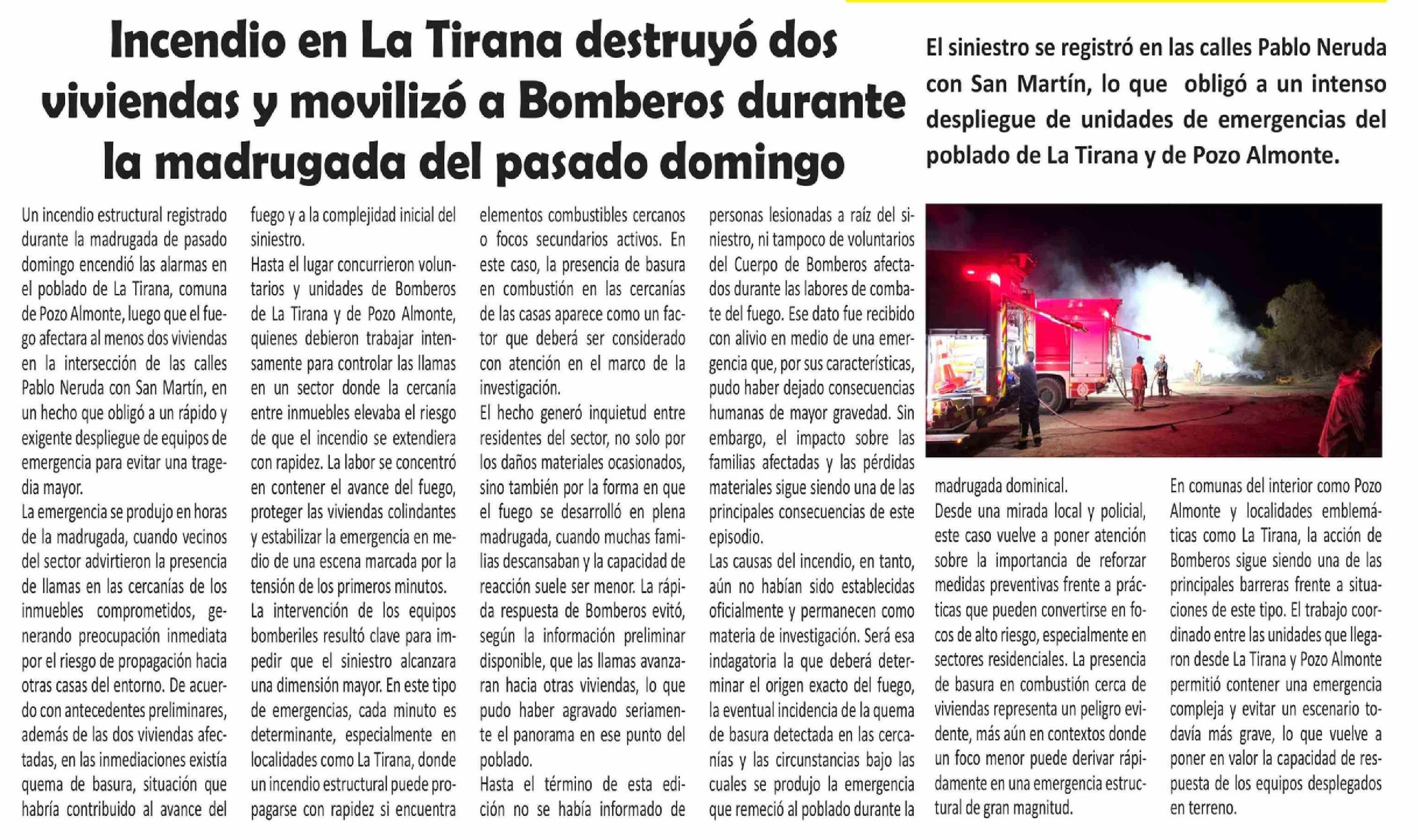 Título: Incendio en La Tirana destruyó dos viviendas y movilizó a Bomberos durante la madrugada del pasado domingo