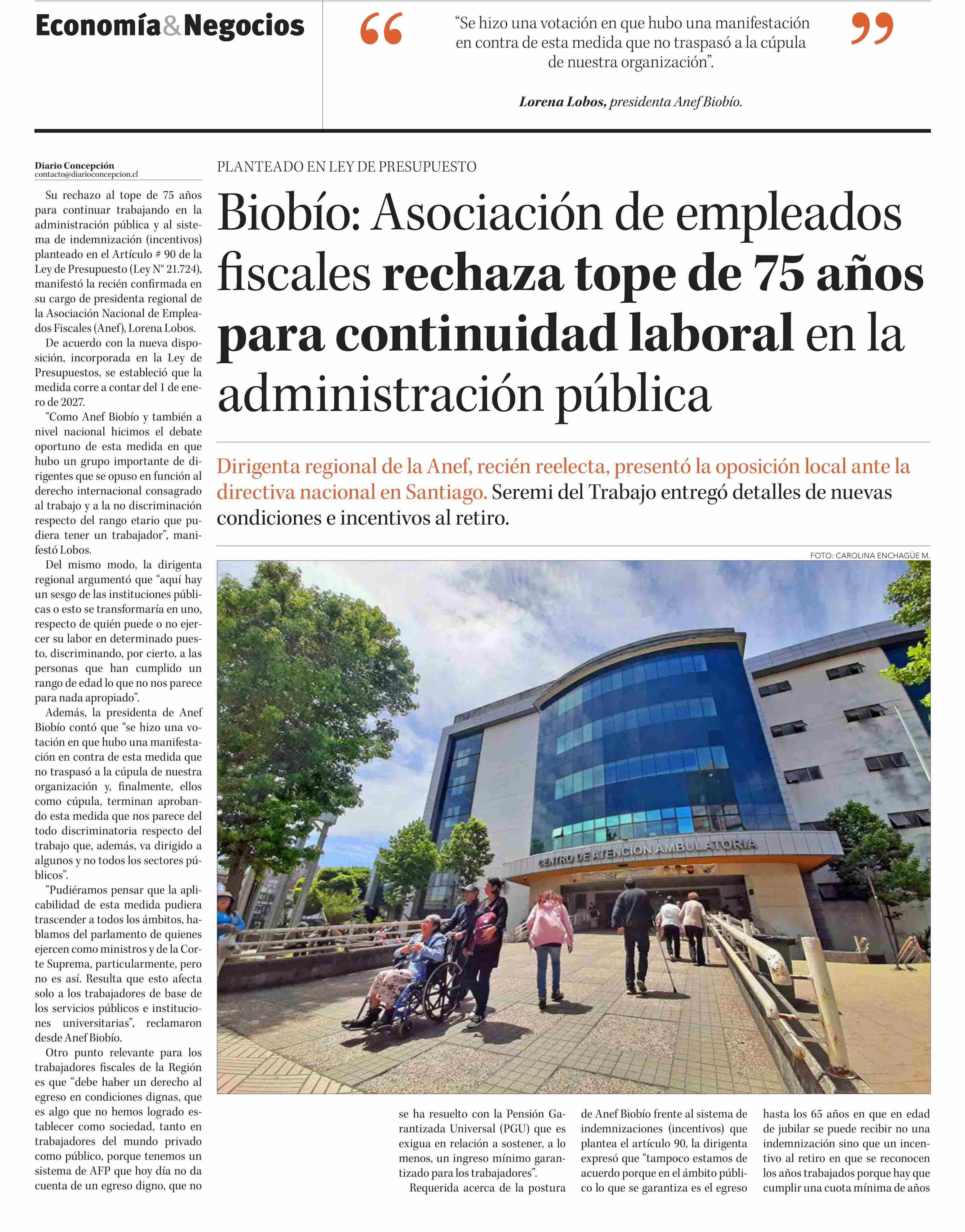 Biobío: Asociación de empleados fiscales rechaza tope de 75 años para continuidad laboral en la administración pública 11-06-2025 Diario Concepción |