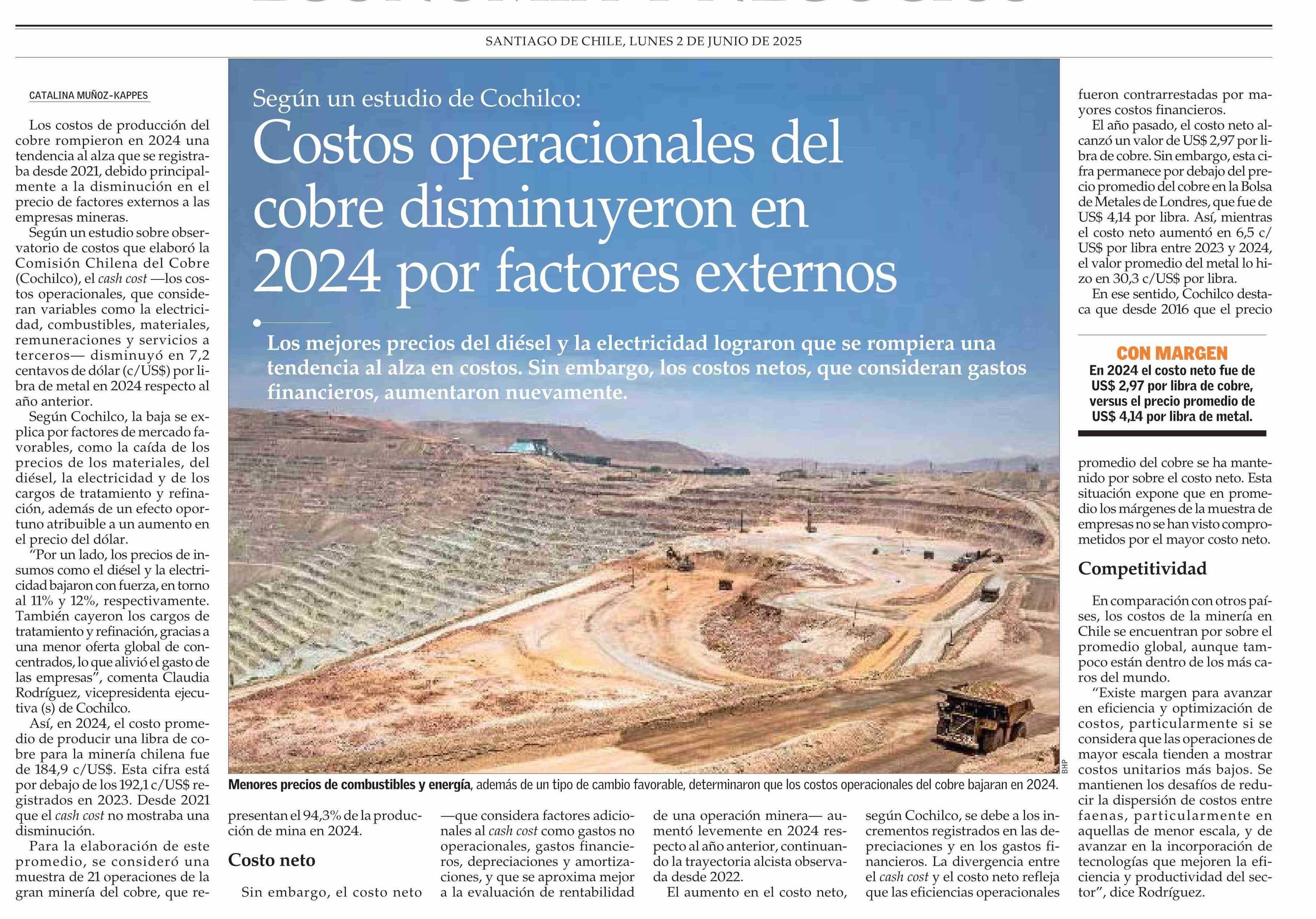 Costos operacionales del cobre disminuyeron en 2024 por factores externos 02-06-2025 El Mercurio |