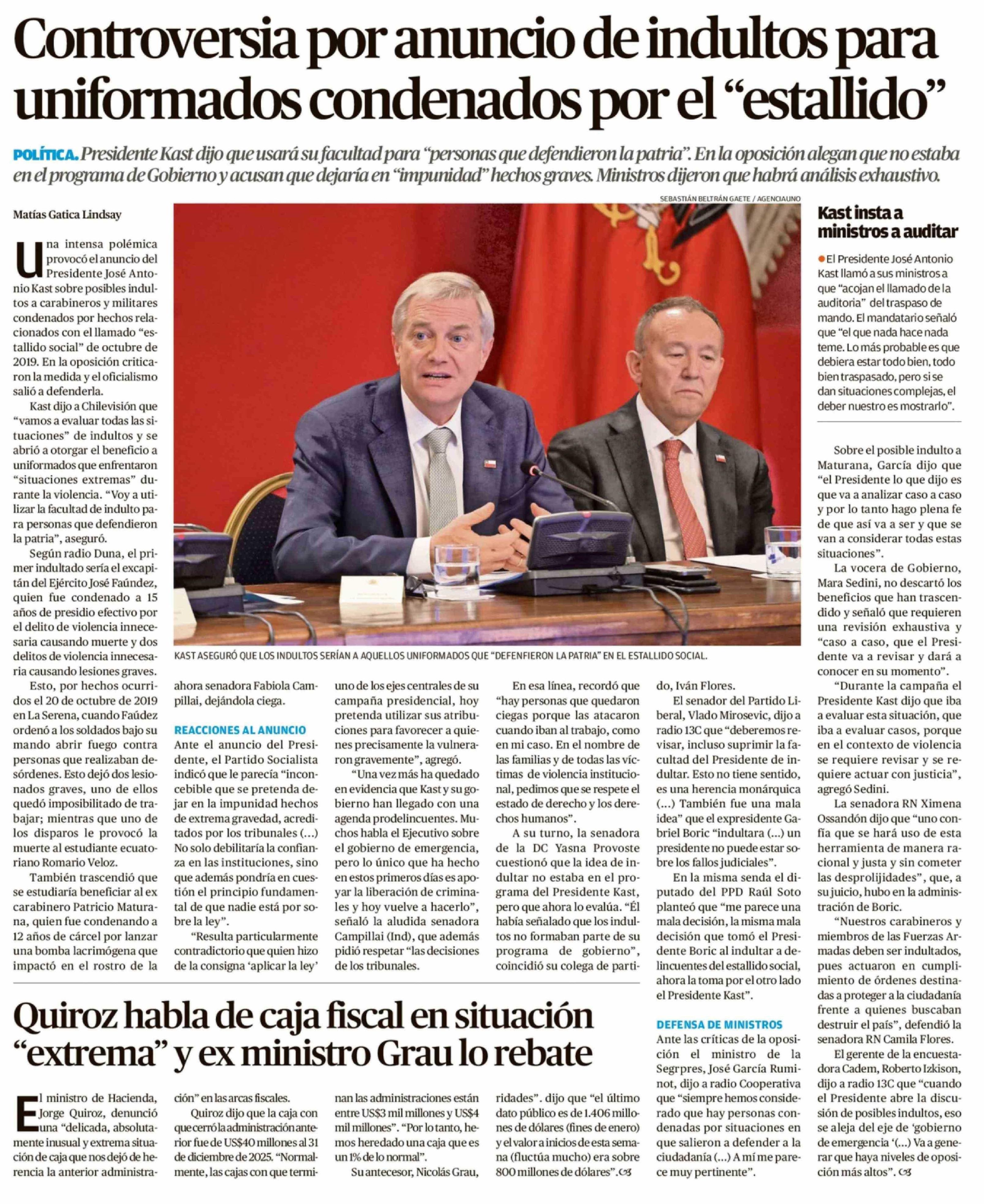Controversia por anuncio de indultos para uniformados condenados por el "estallido" 14-03-2026 Crónica de Chillán |