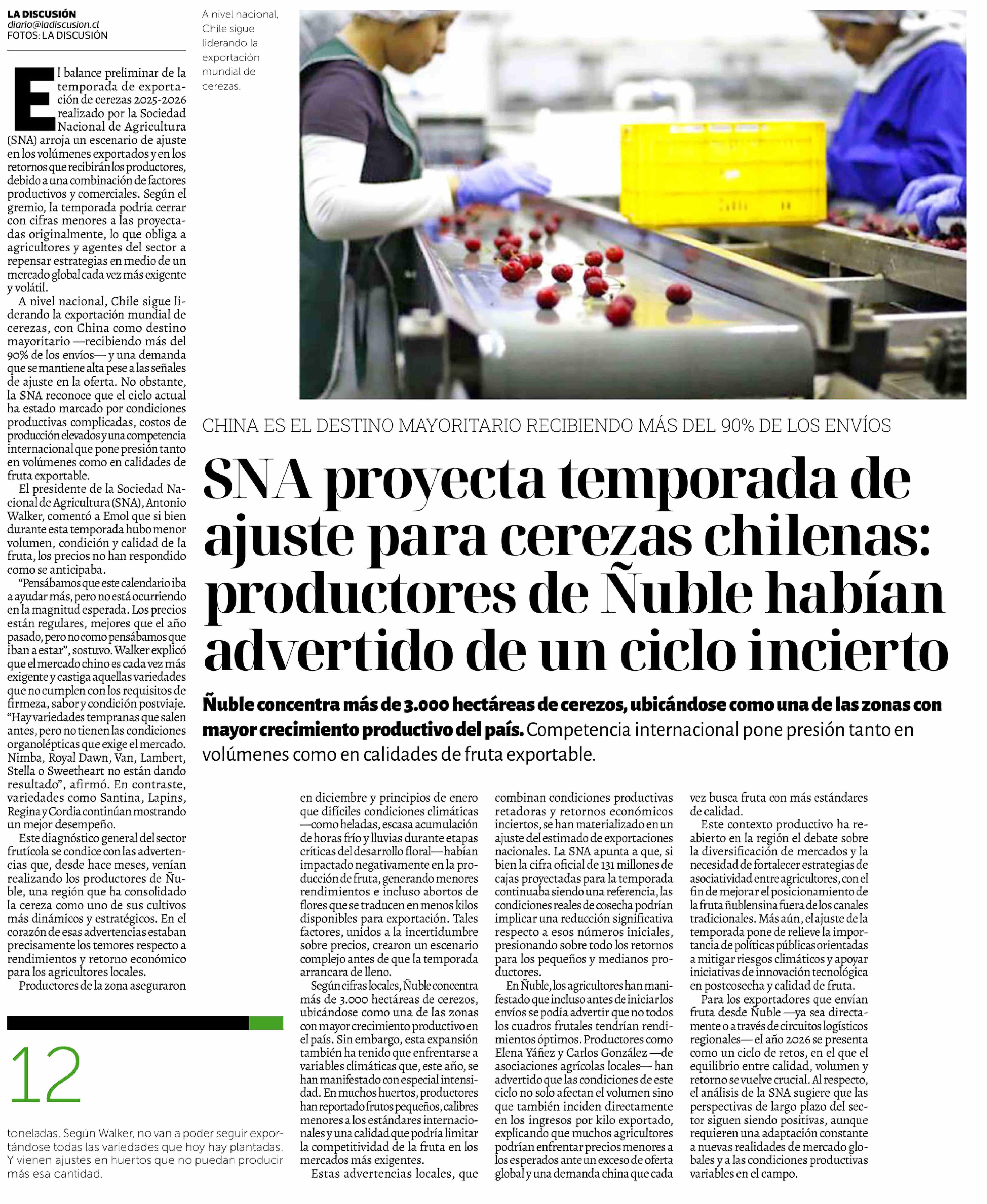 SNA proyecta temporada de ajuste para cerezas chilenas: productores de Nuble habían advertido de un ciclo incierto 01-02-2026 La Discusión |